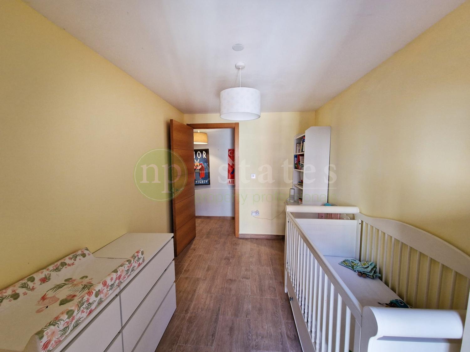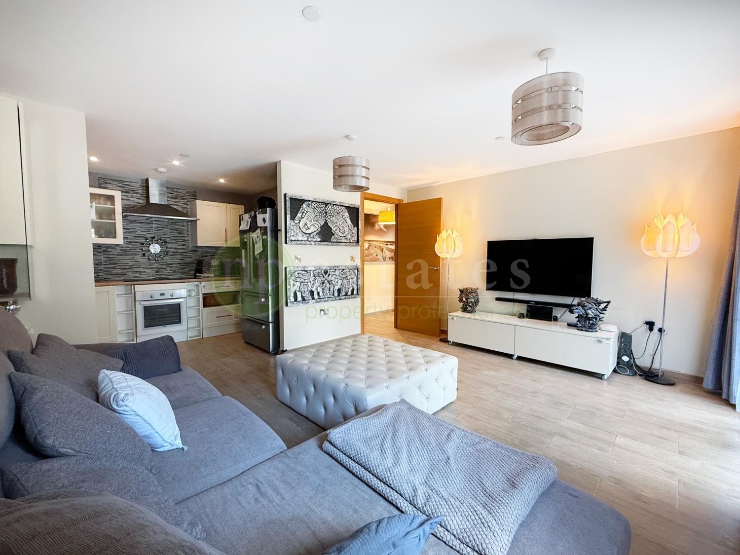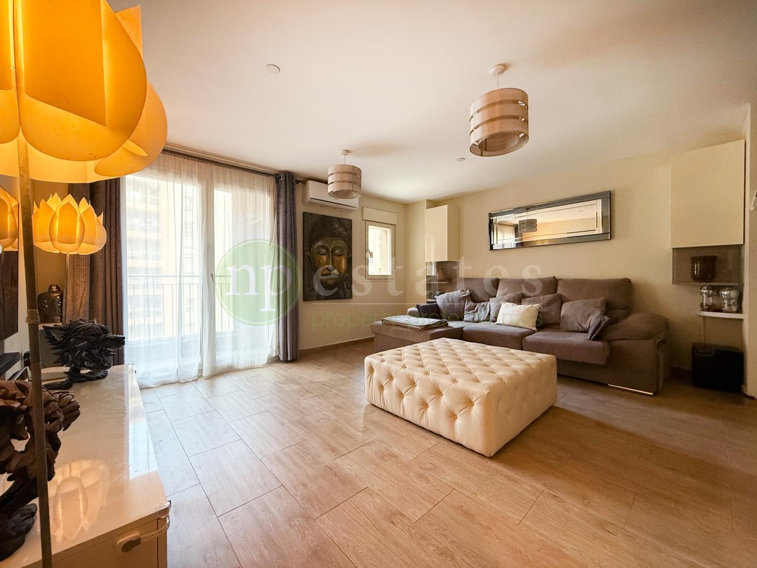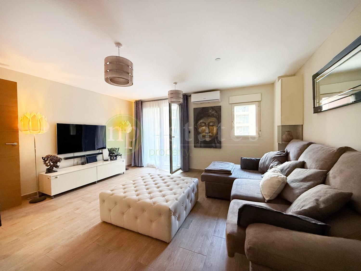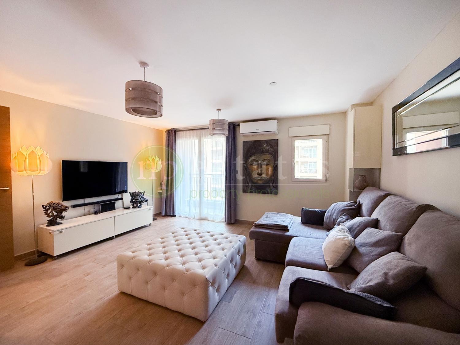 The property features an open-plan kitchen and living area, along with three double bedrooms and a refurbished bathroom finished in modern porcelain tiling. Air conditioning is installed in the living room, while the balcony has been enclosed with high-quality glass curtains, allowing year-round use as an additional living space.