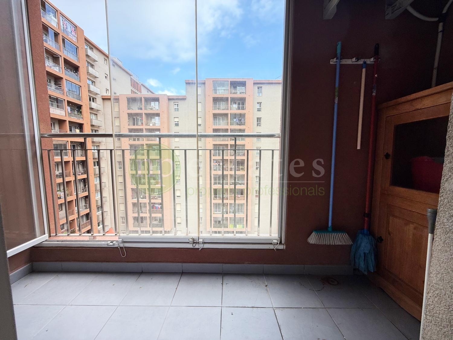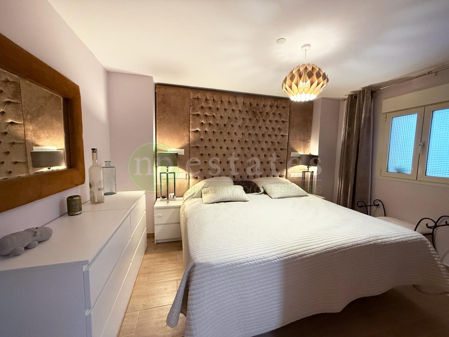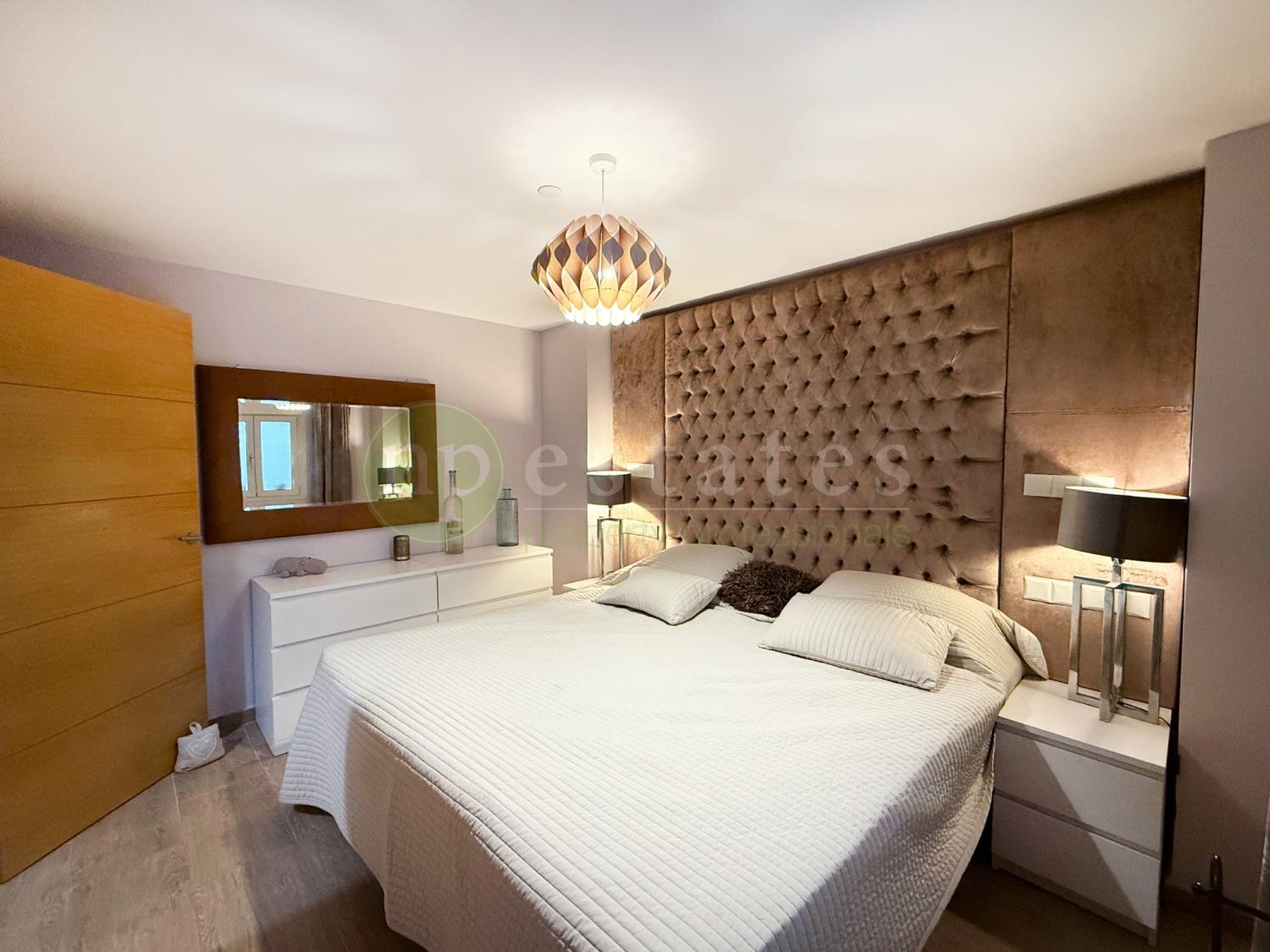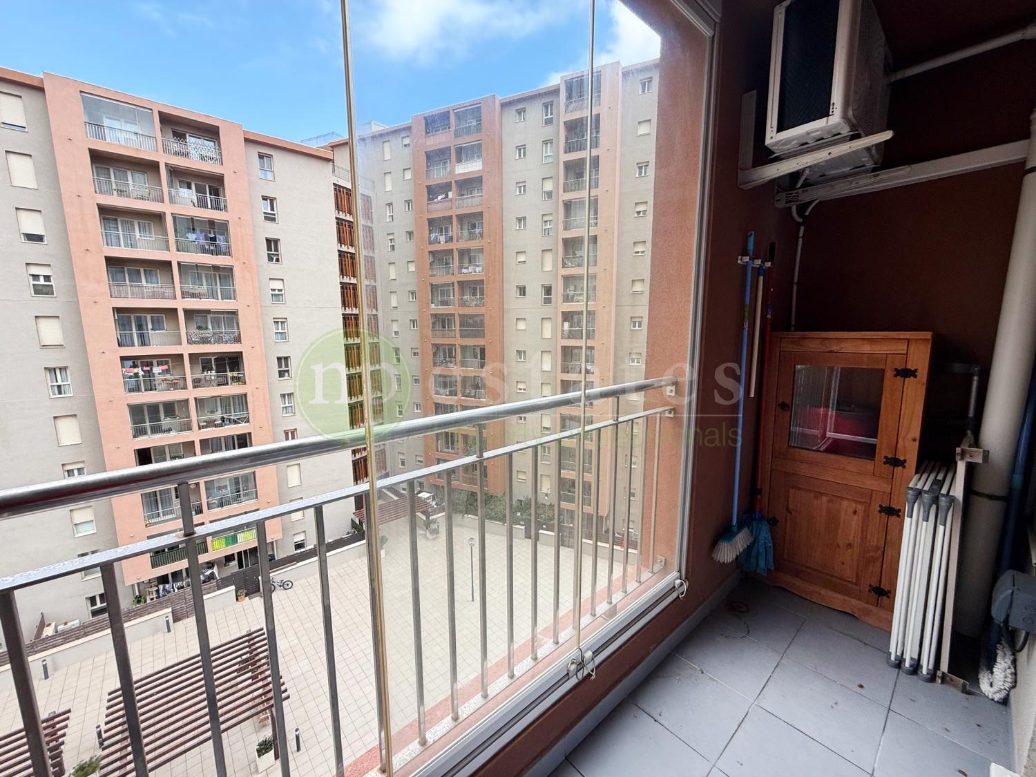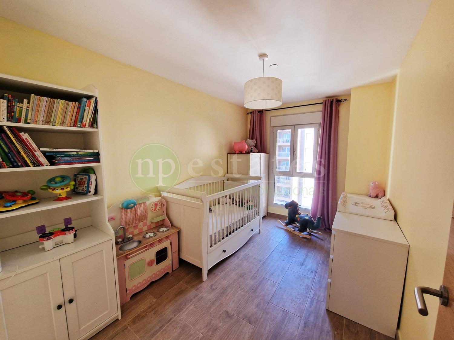 The property features an open-plan kitchen and living area, along with three double bedrooms and a refurbished bathroom finished in modern porcelain tiling. Air conditioning is installed in the living room, while the balcony has been enclosed with high-quality glass curtains, allowing year-round use as an additional living space.