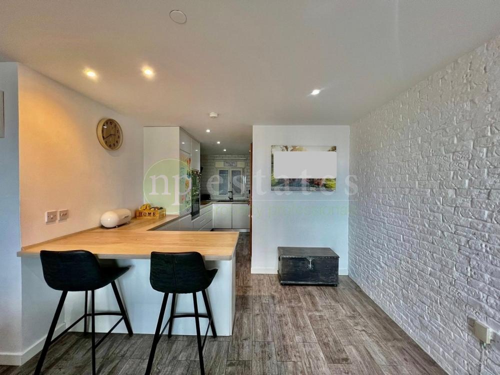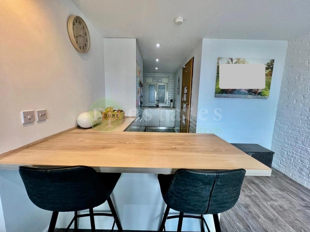 The revised layout creates a larger, more comfortable living room, which opens onto a private balcony This space works well for everyday use and enjoys open outlooks across the surrounding area. The open-plan kitchen connects directly to the living space and is supported by a separate utility room housing the boiler, washing machine, dryer, and additional storage.