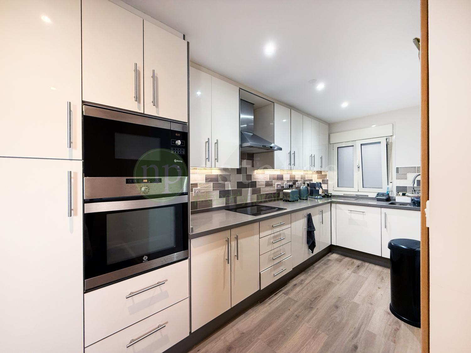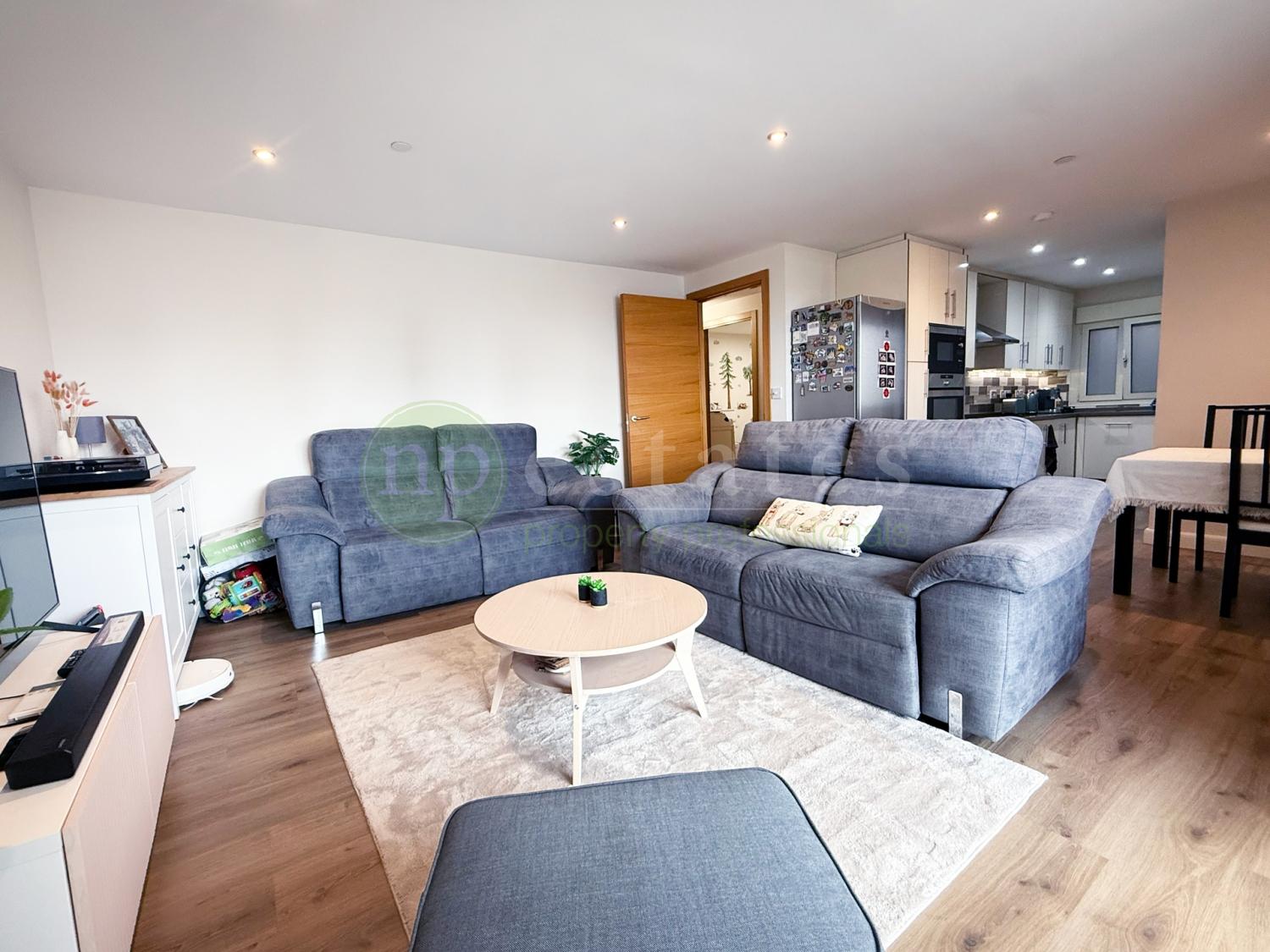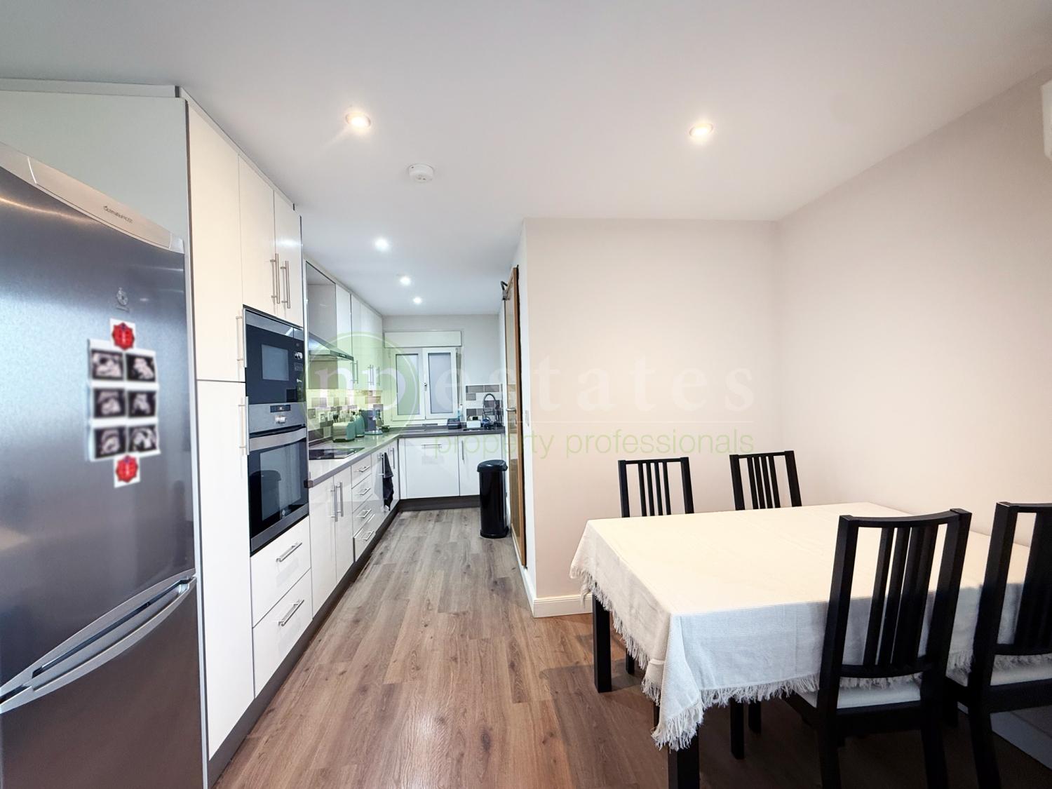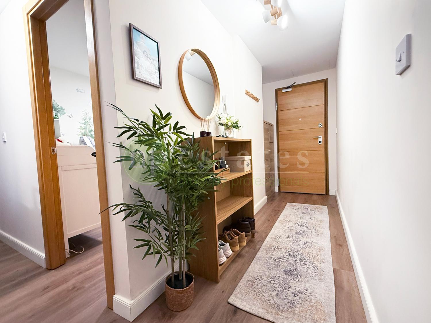 The apartment offers a comfortable layout with three double bedrooms and a generous living area featuring air conditioning and an open plan fully fitted modern kitchen. The kitchen leads through to a large utility room housing the washing machine, dryer and boiler, practical space for laundry and additional storage.