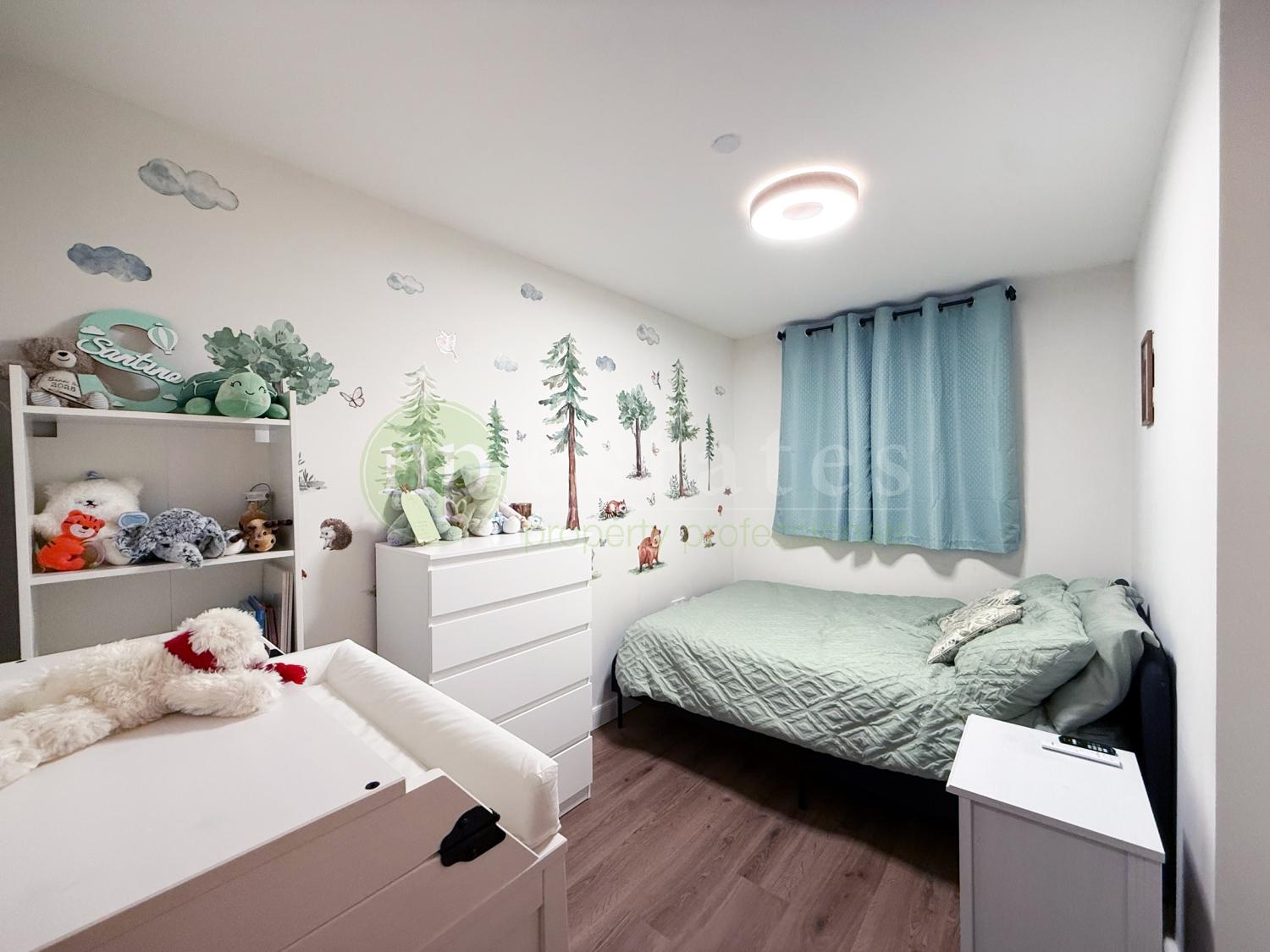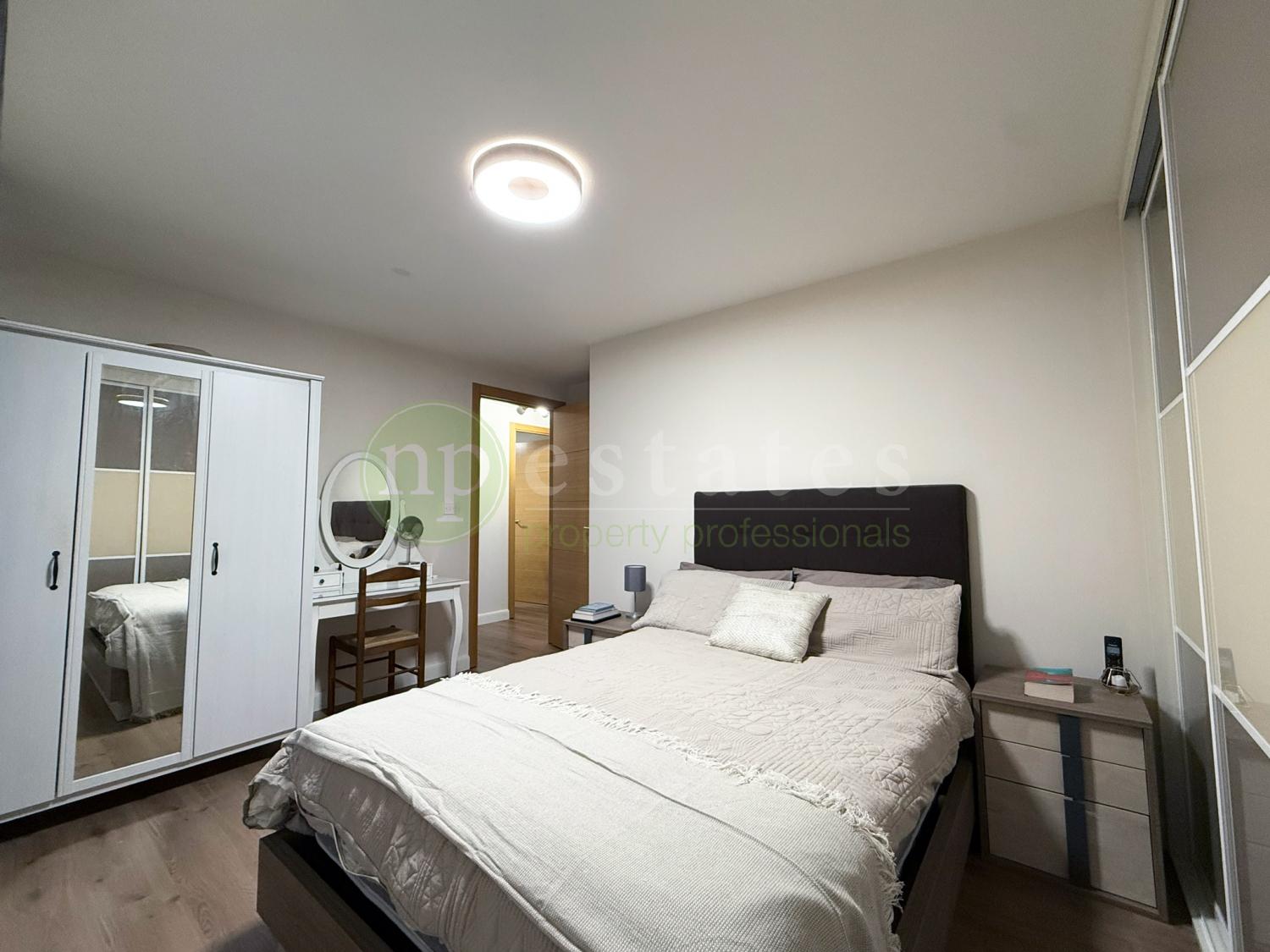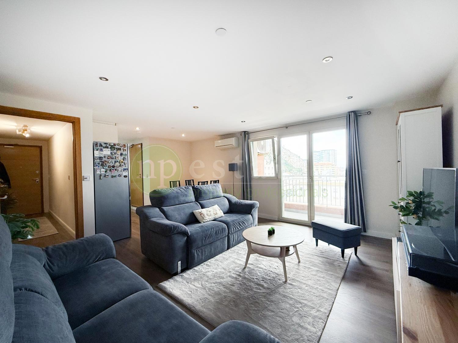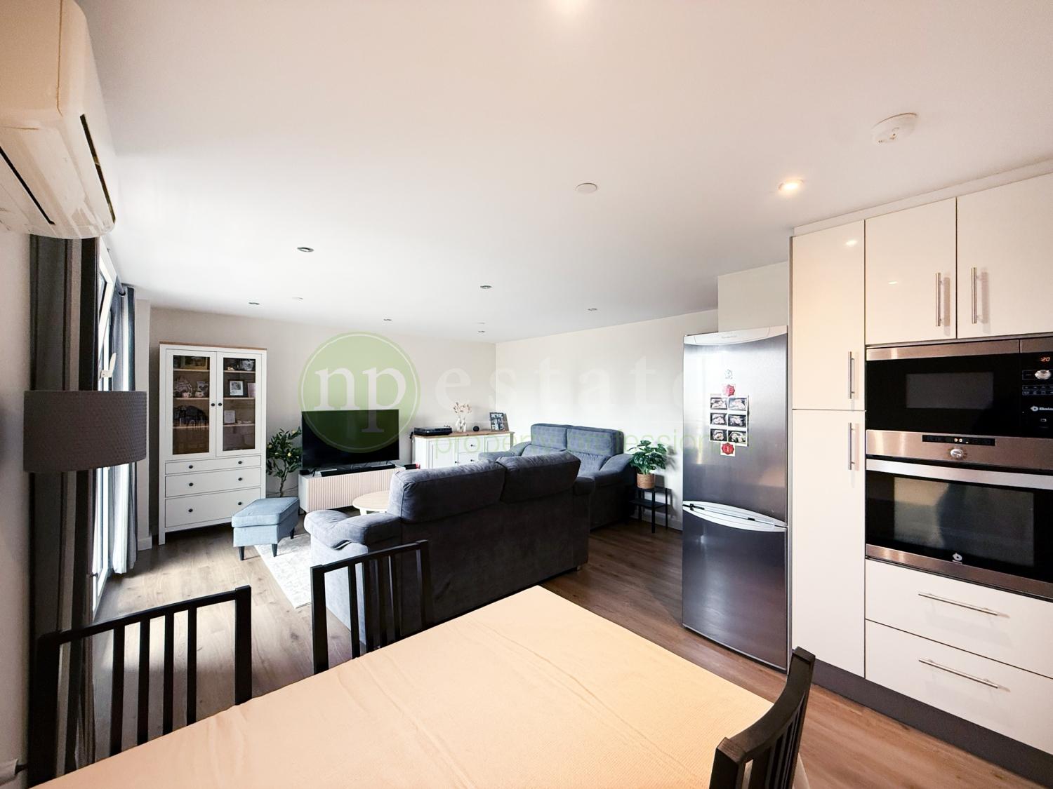 The apartment offers a comfortable layout with three double bedrooms and a generous living area featuring air conditioning and an open plan fully fitted modern kitchen. The kitchen leads through to a large utility room housing the washing machine, dryer and boiler, practical space for laundry and additional storage.