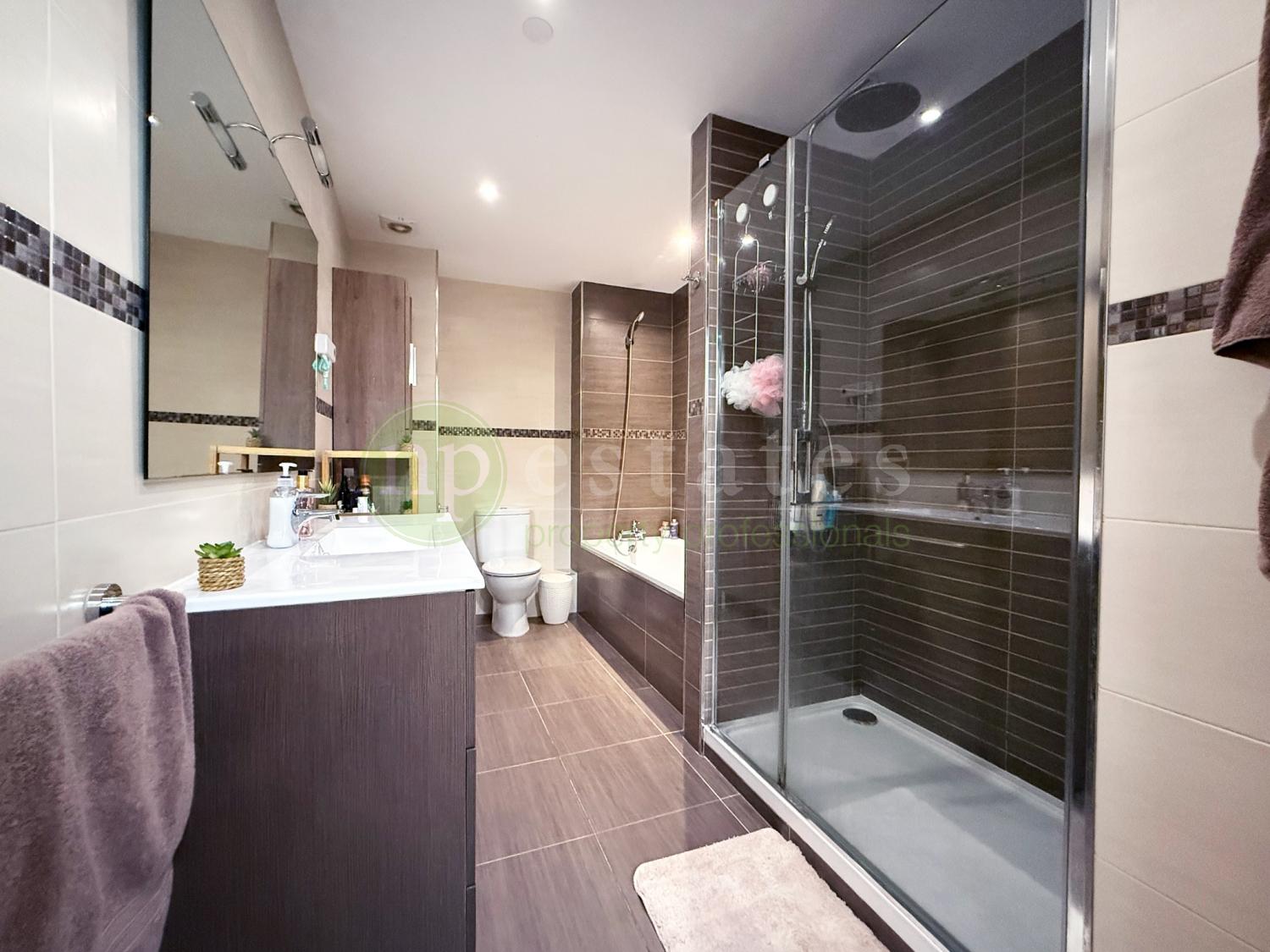 The family bathroom is spacious and includes both a bathtub and separate shower.