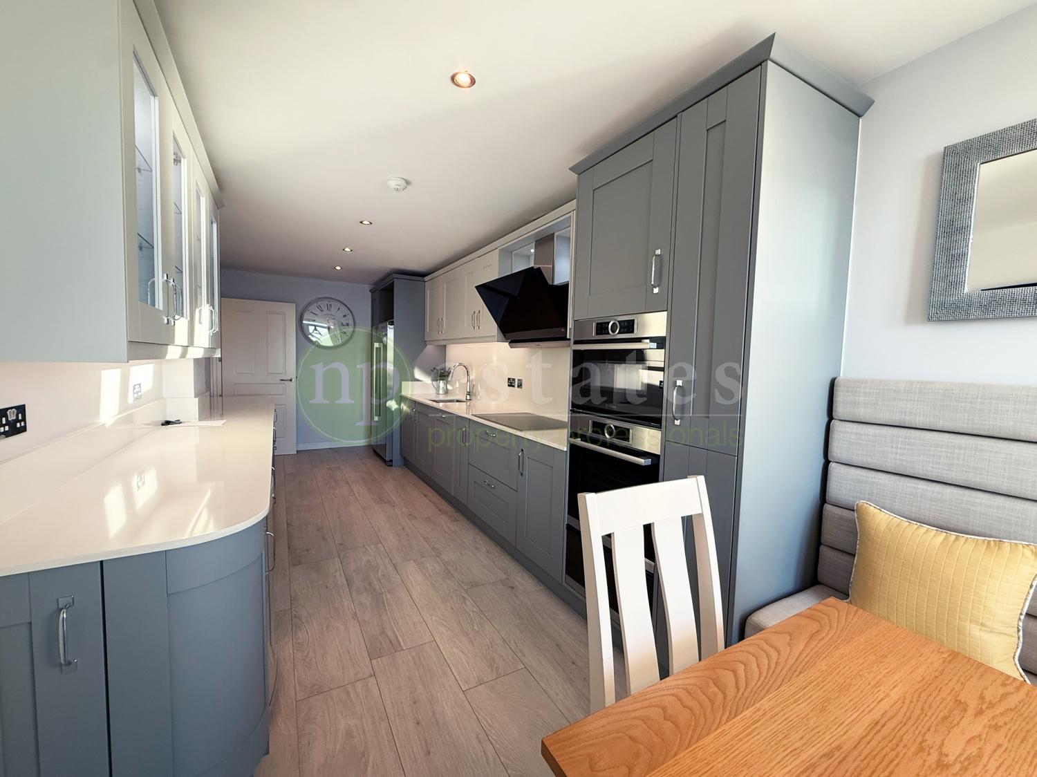 The property features elegant hardwood flooring throughout, a sleek, fully fitted high-spec kitchen, and ample integrated storage. The master bedroom benefits from an en suite with a contemporary finish, while the family bathroom is offers a bath.