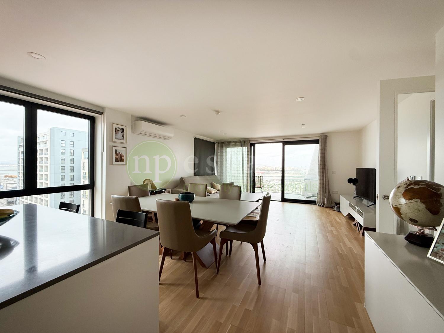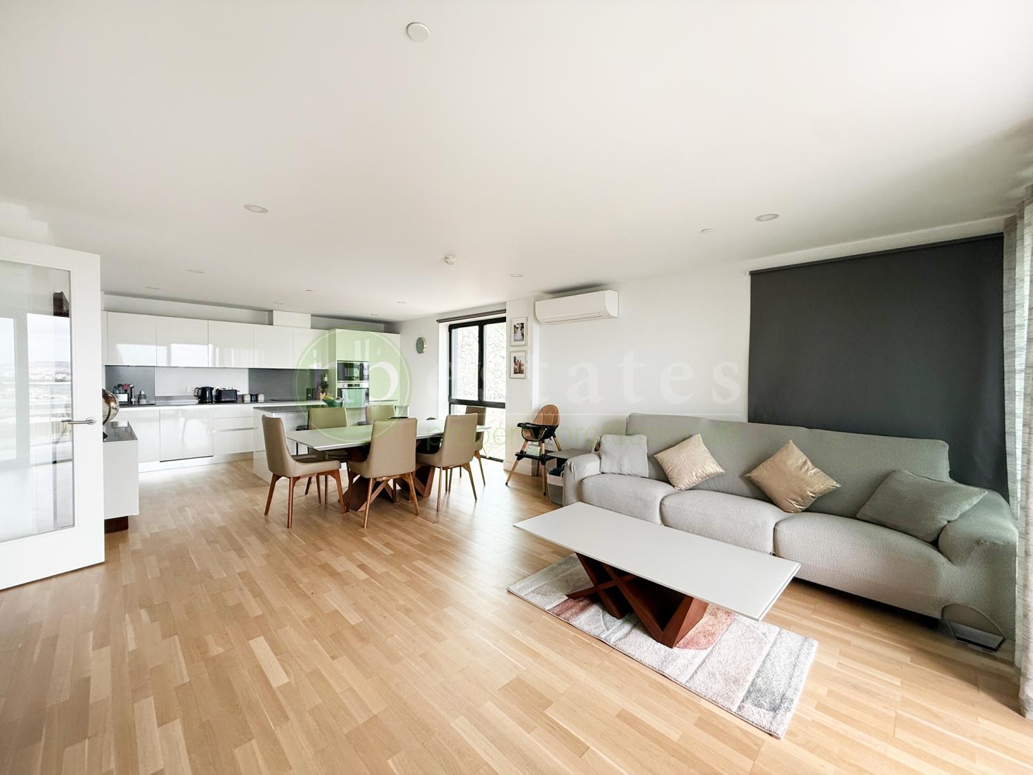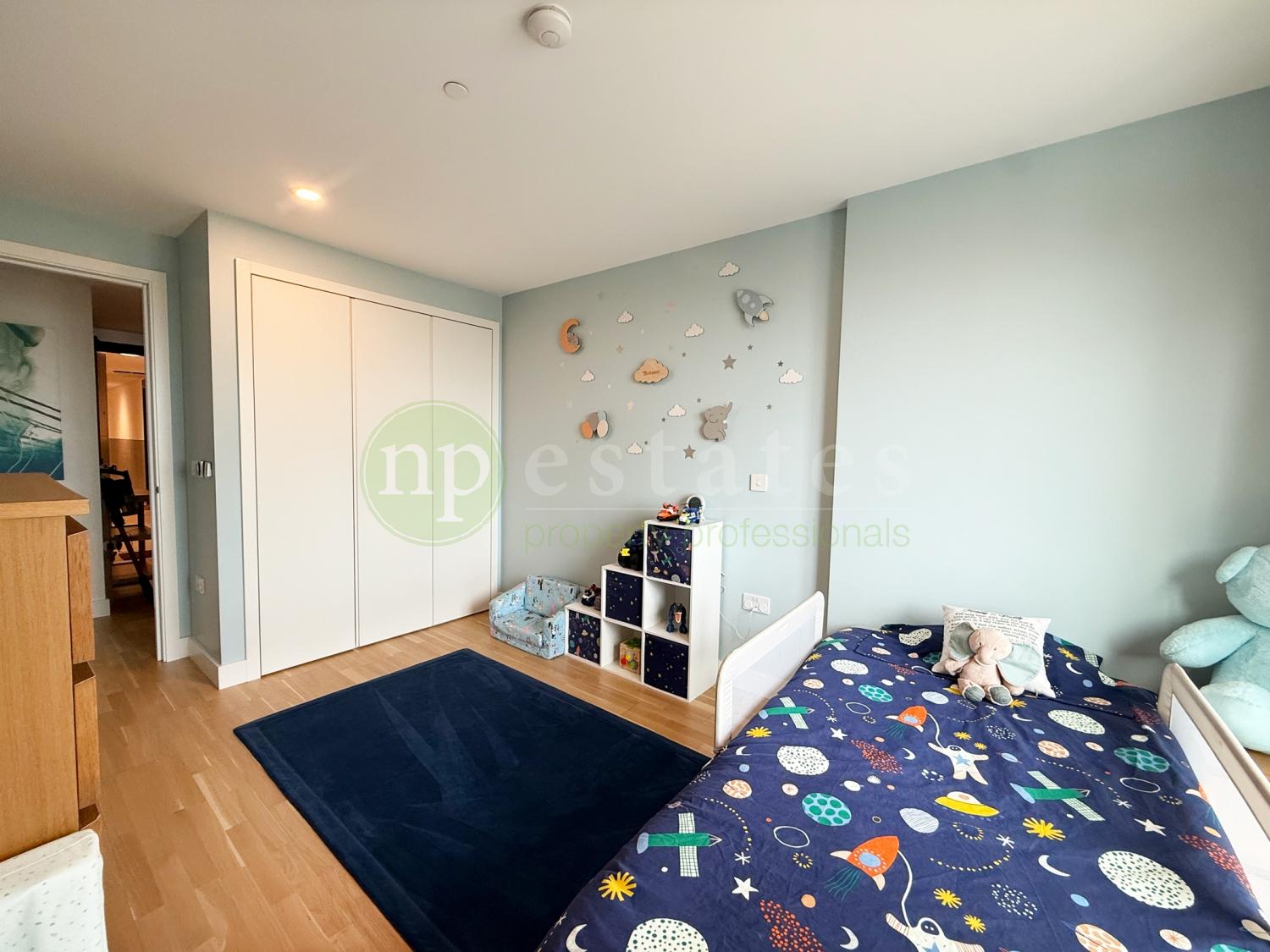 The layout includes a generous master bedroom with walk-in wardrobe and en-suite bathroom, alongside two further bedrooms and a separate family bathroom. Integrated heating and cooling, recessed LED lighting, and clean modern finishes run throughout the apartment.