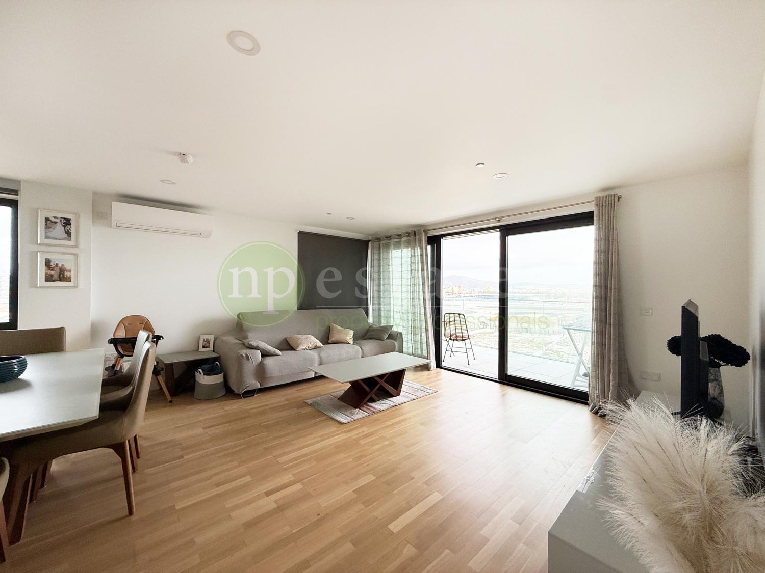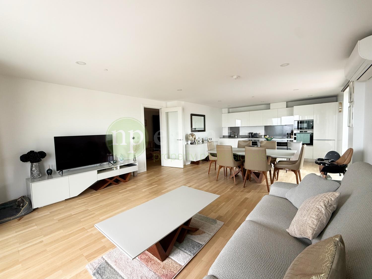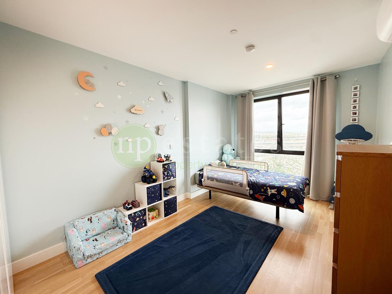 The layout includes a generous master bedroom with walk-in wardrobe and en-suite bathroom, alongside two further bedrooms and a separate family bathroom. Integrated heating and cooling, recessed LED lighting, and clean modern finishes run throughout the apartment.