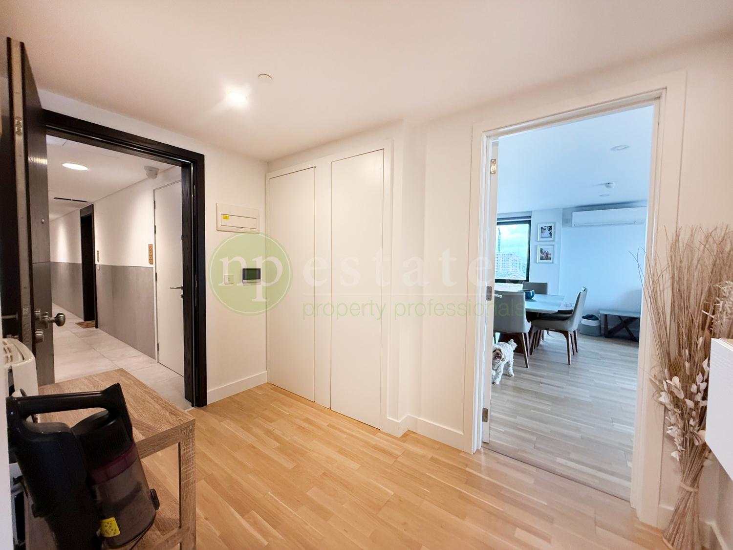 The apartment is arranged around a spacious living room with a modern open-plan kitchen, complete with a central island that works well for everyday use and informal dining. Integrated air conditioning is installed throughout the property, and a practical utility cupboard is located off the entrance hallway, providing discreet storage for laundry and household items.