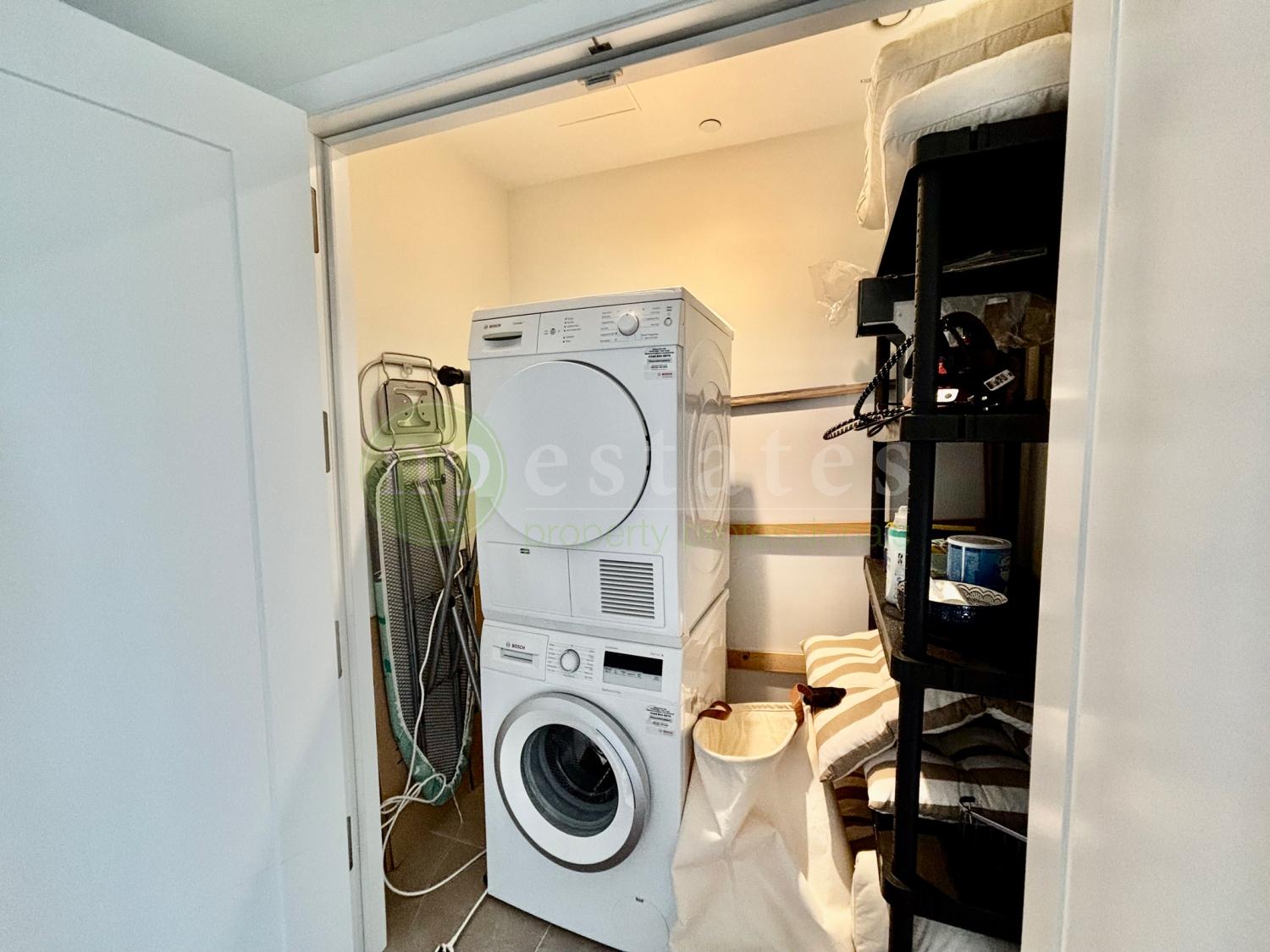 A separate utility cupboard houses the washer and dryer with additional space for laundry storage. The hallway leads into a large open plan living and dining room with a contemporary kitchen and breakfast bar. Floor to ceiling sliding doors allow for abundant natural light and open onto an impressive wrap around terrace of approximately 39m² with a south west orientation, creating a substantial outdoor area well suited for relaxing or entertaining.