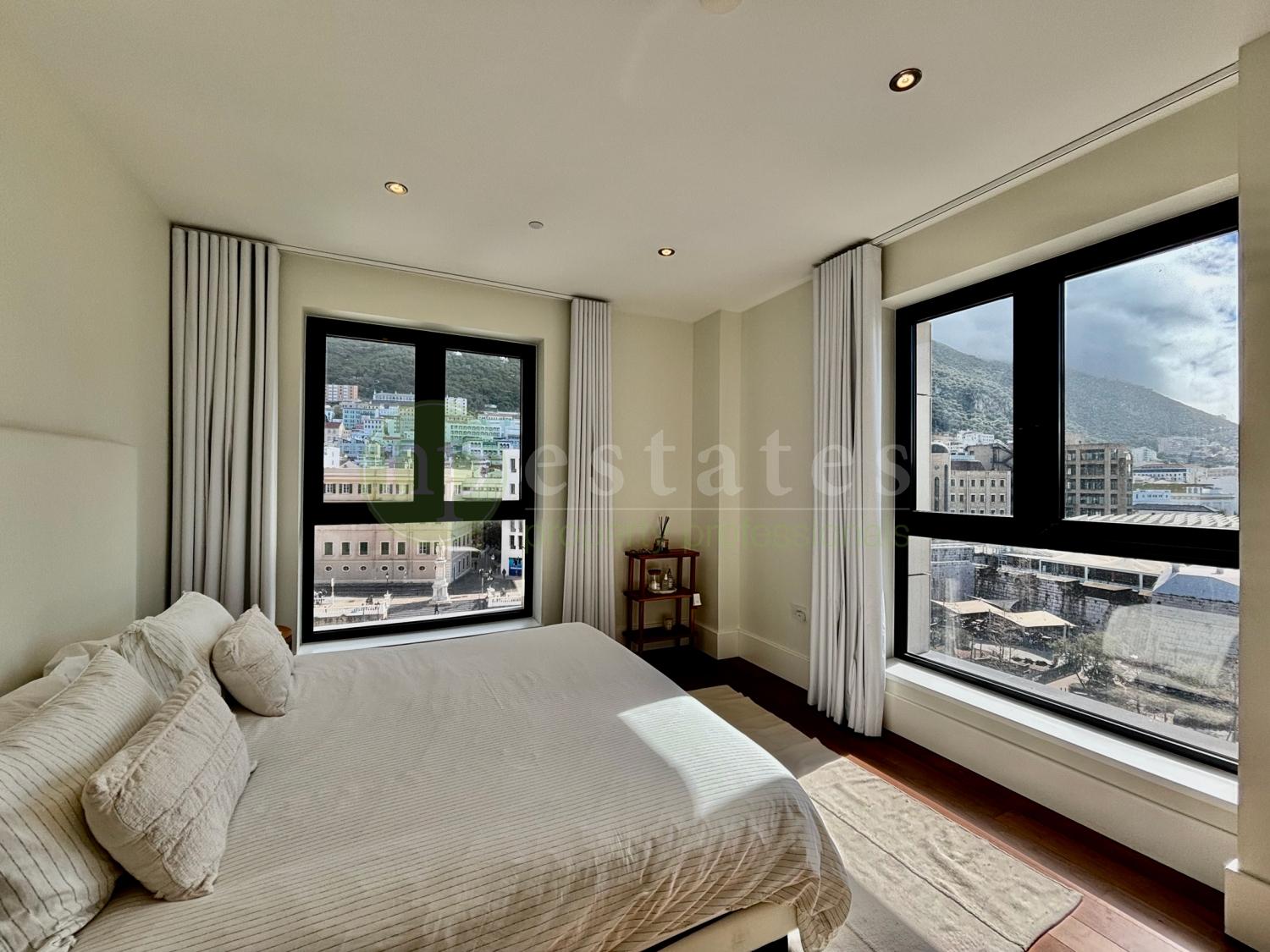 The apartment opens into a welcoming entrance hallway with a practical storage cupboard for coats and everyday items. Both bedrooms are positioned to enjoy east facing views towards the Rock and town. The principal bedroom benefits from an en suite bathroom and a spacious walk in wardrobe, providing excellent storage and dressing space. The second double bedroom includes fitted wardrobes and is served by a modern family bathroom.