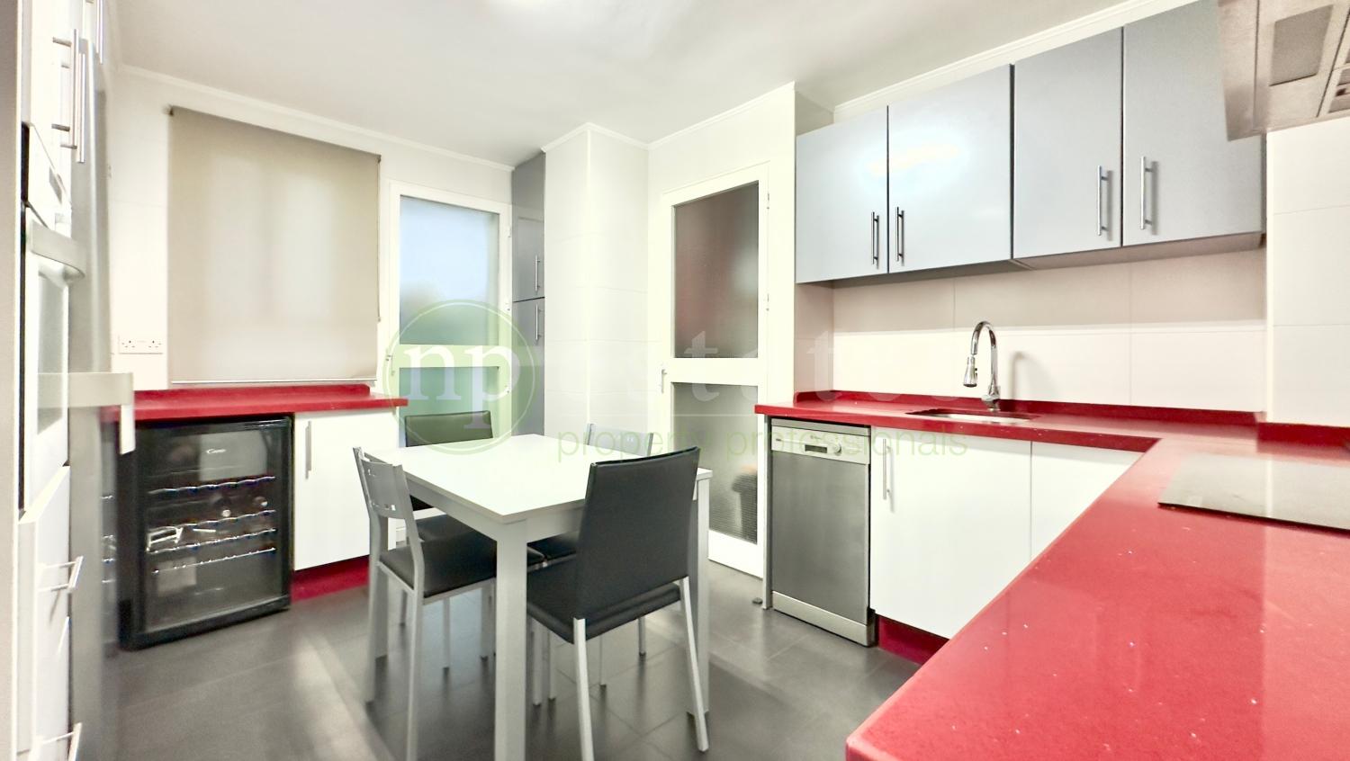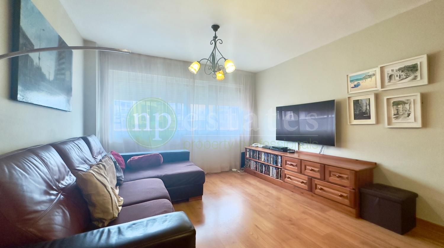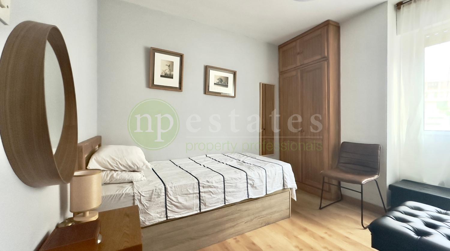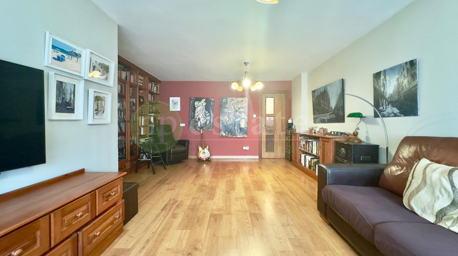 Located on a low floor, the apartment enjoys good natural light and a practical layout. The property includes a spacious living room, a separate fully fitted kitchen, and ample built-in storage throughout.