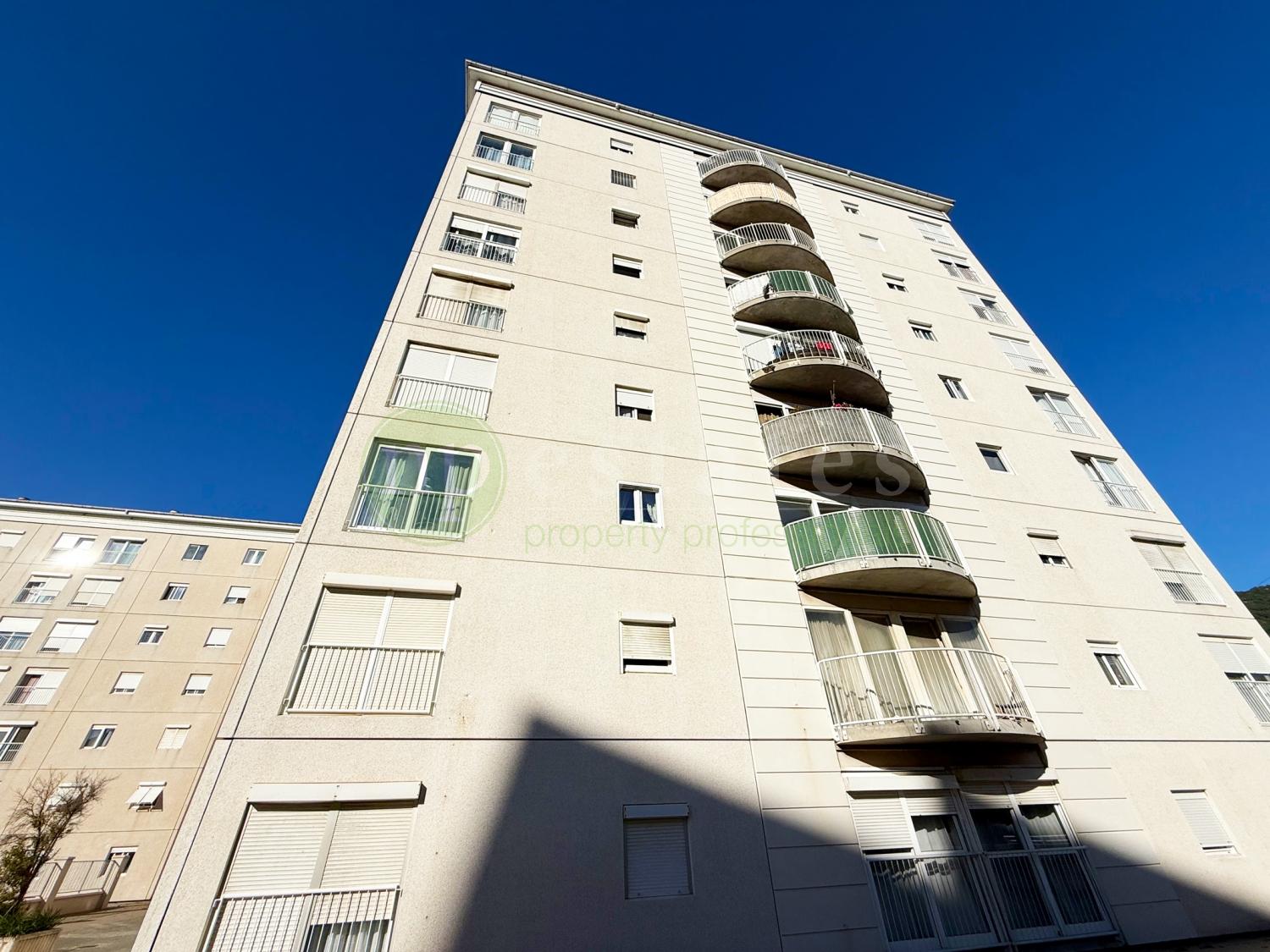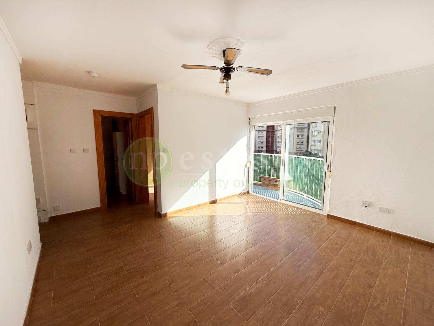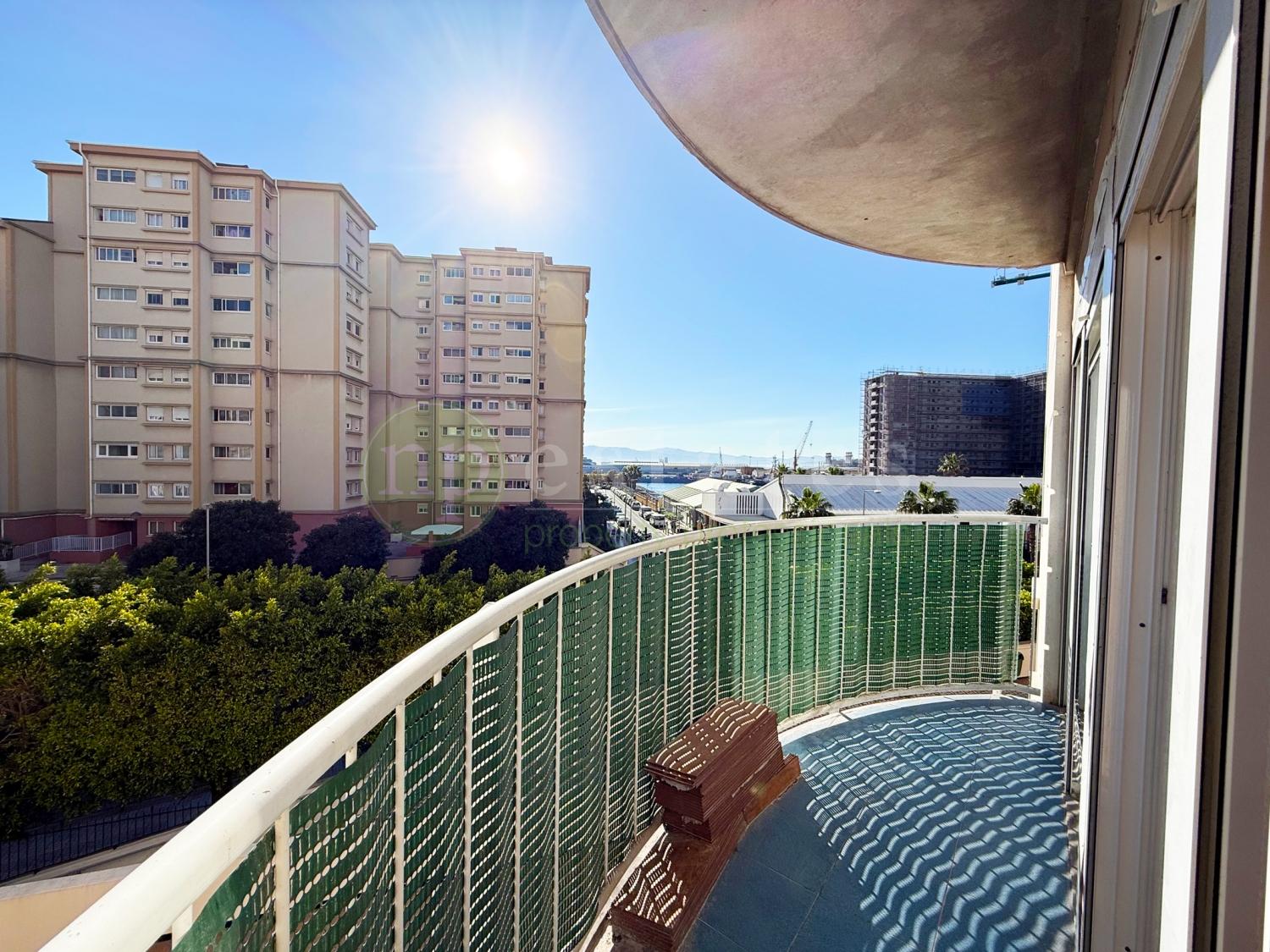 The property offers a bright and airy layout with a living area leading onto a large curved balcony, enjoying partial sea views towards the west and strong afternoon sunlight.