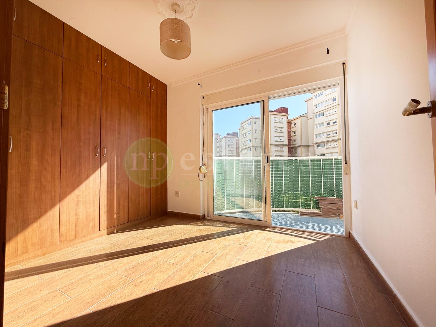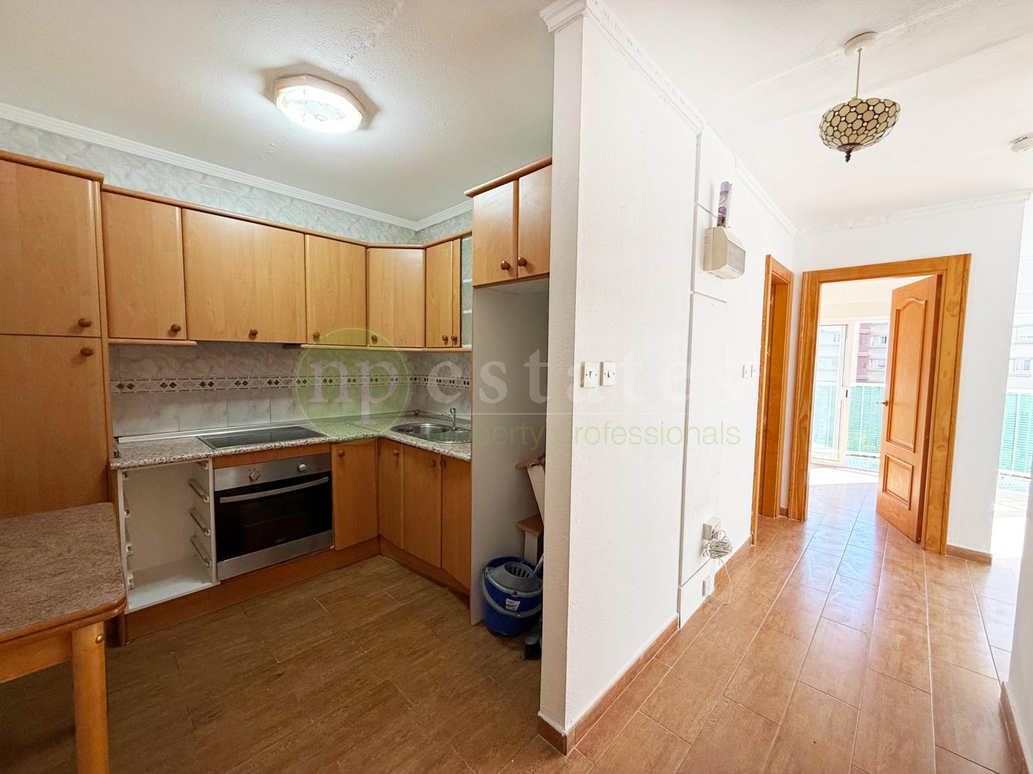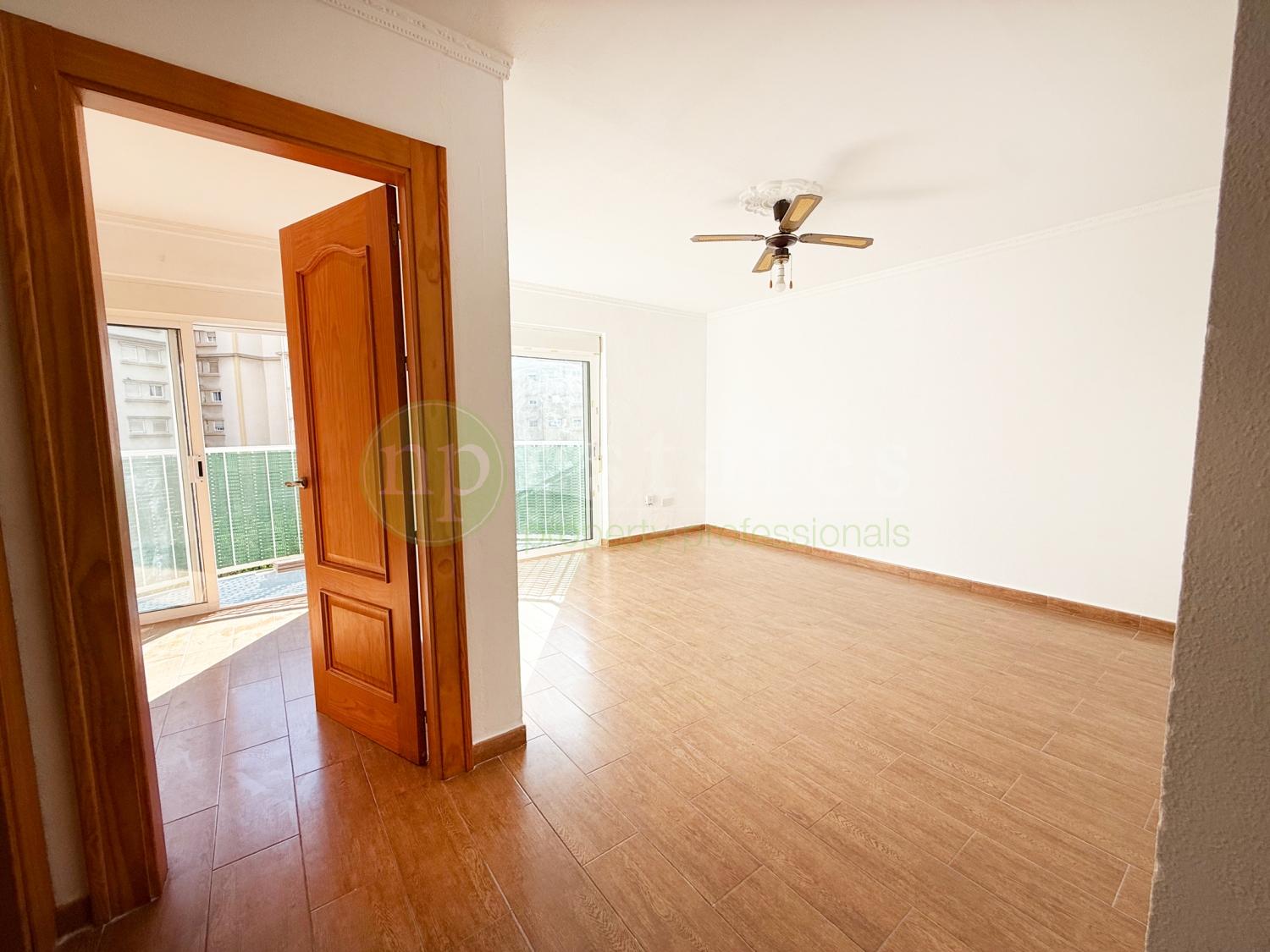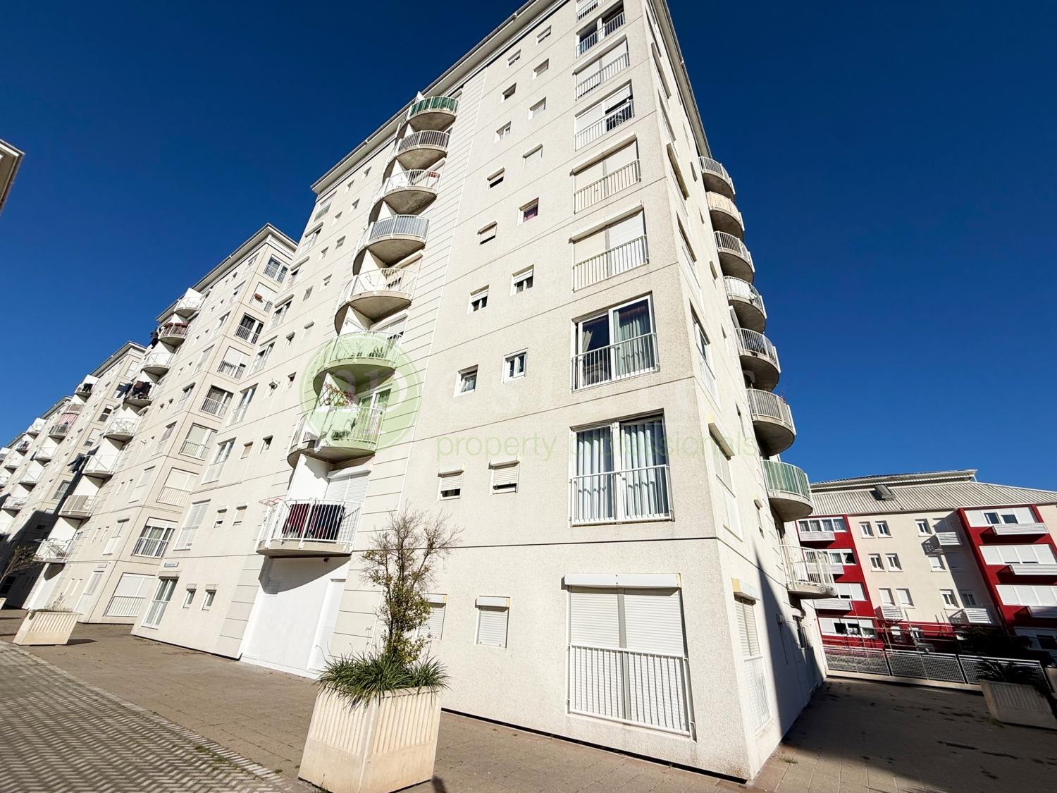 The property offers a bright and airy layout with a living area leading onto a large curved balcony, enjoying partial sea views towards the west and strong afternoon sunlight.