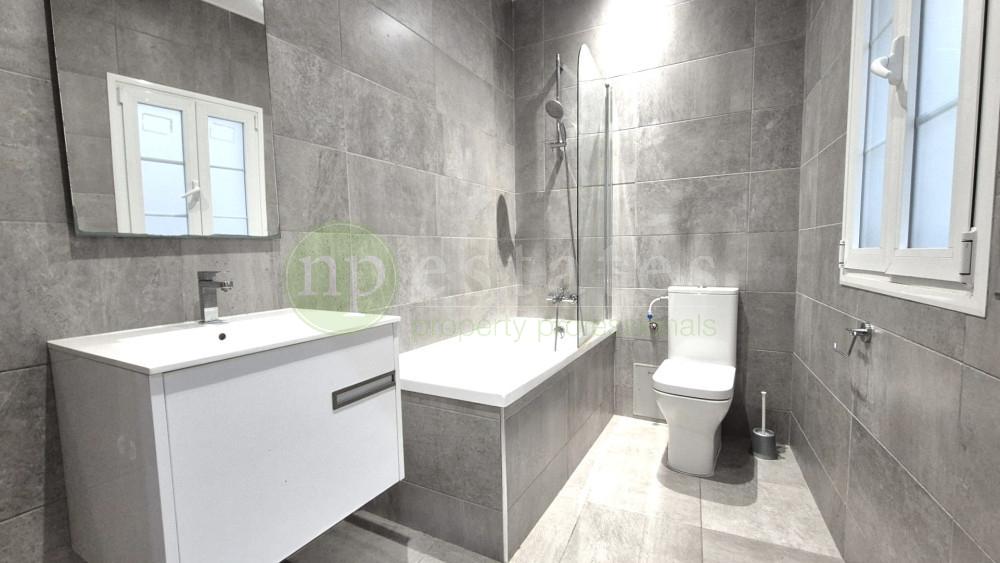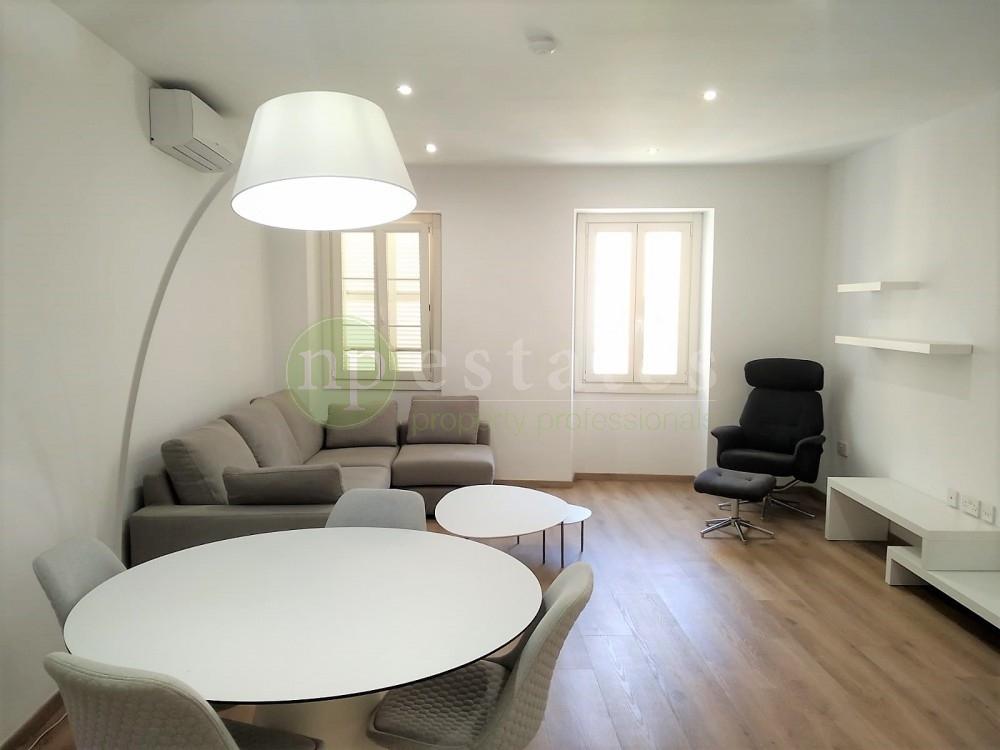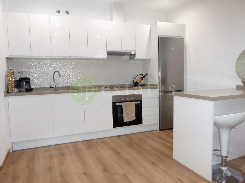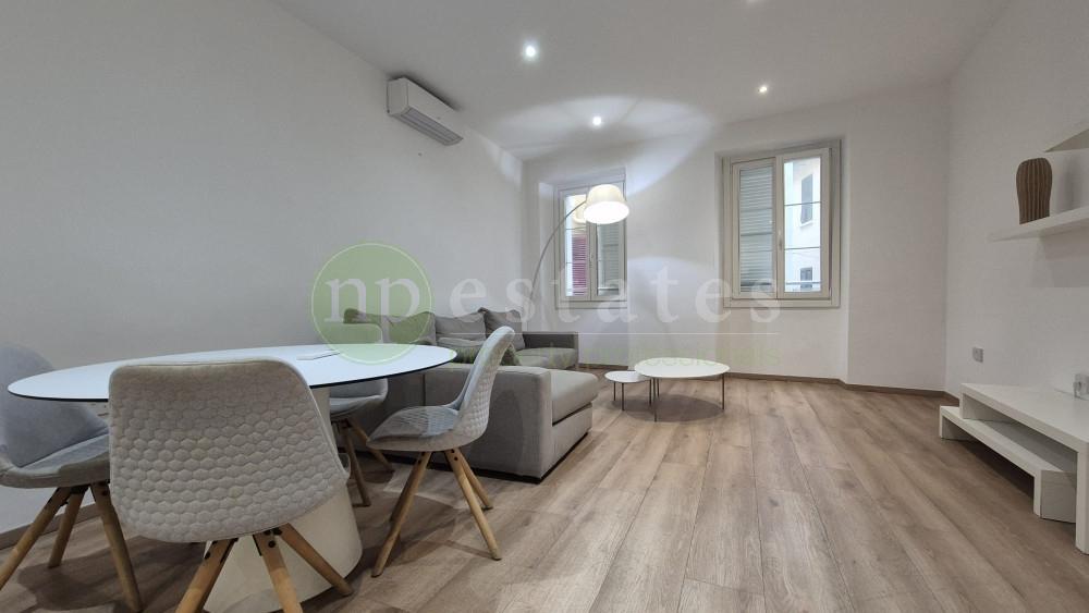 The apartment features high ceilings and a clean, contemporary layout. The fitted kitchen is finished with Silestone worktops and an island, while the bathroom is by Porcelanosa. Both bedrooms include built-in wardrobes, and the property is furnished with carefully selected designer pieces. Air conditioning is installed throughout, with lift access and video entry providing added comfort and security.