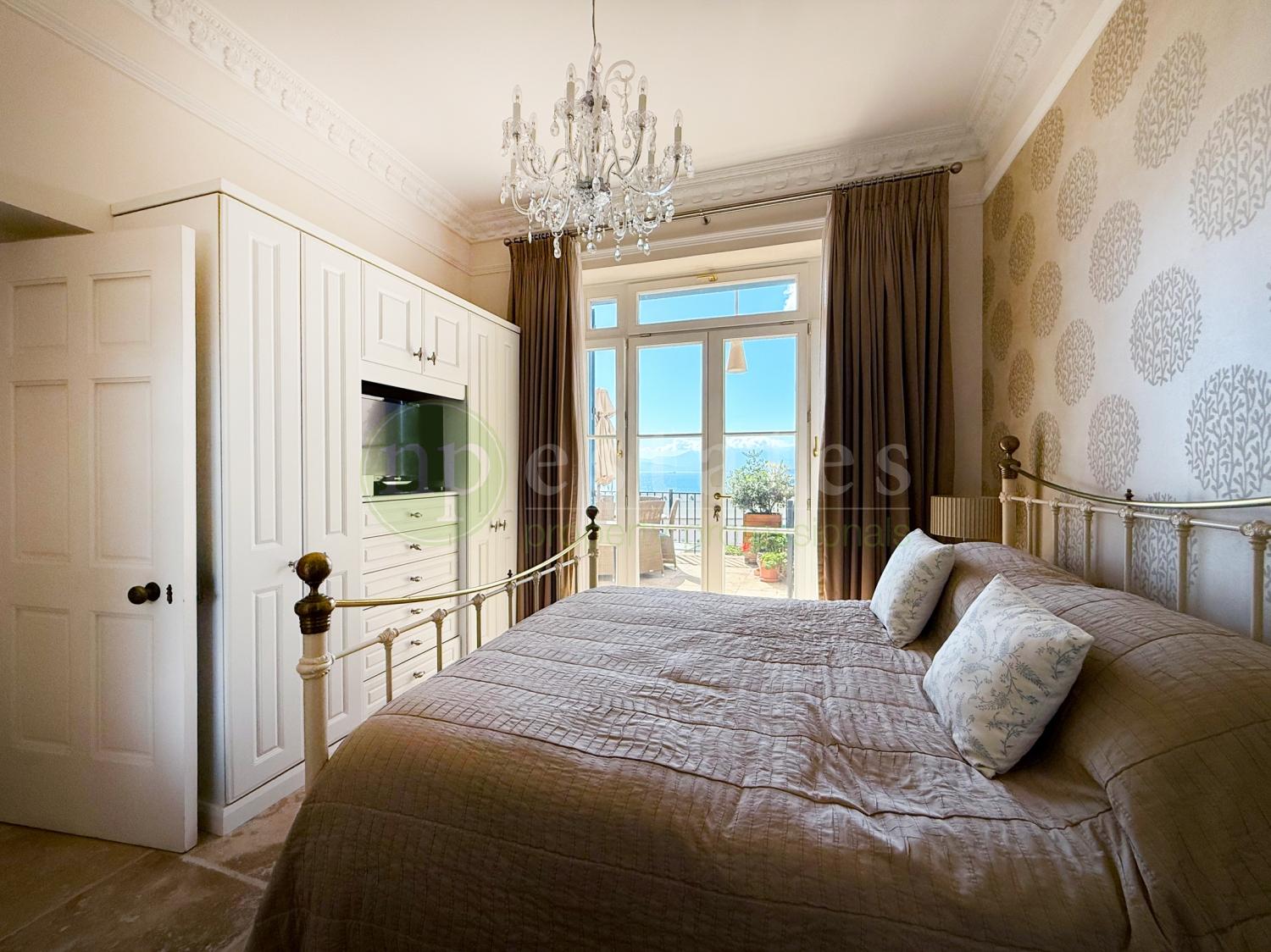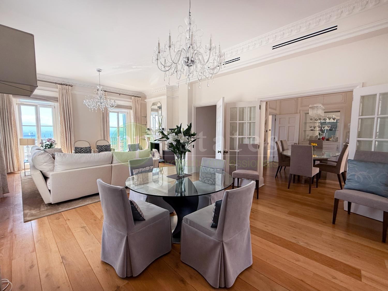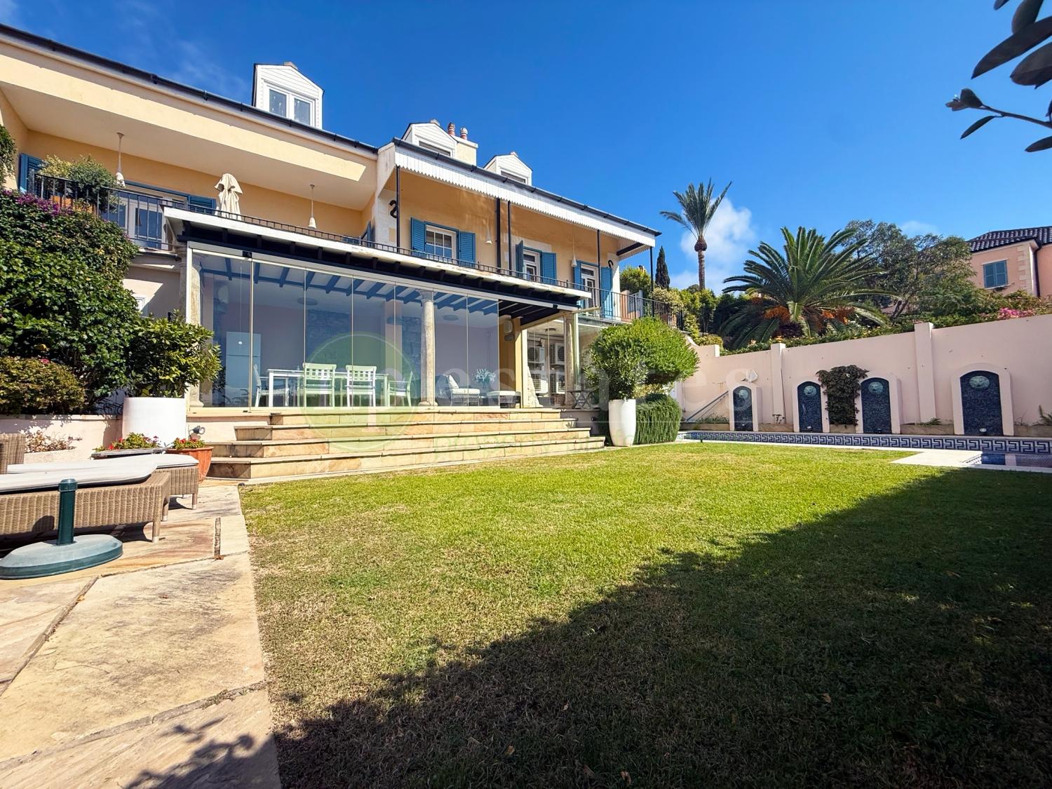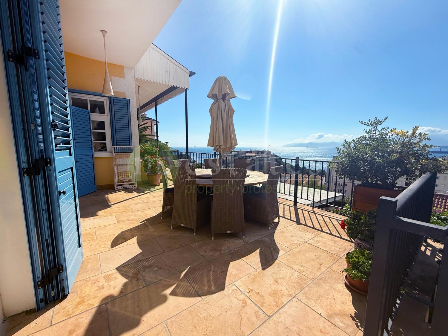 Set across three levels, the property offers generous living space with high ceilings on the main level, original fireplace, and traditional detailing throughout. The main level comprises a welcoming entrance hall with guest toilet, a large dining room, and an elegant living room that opens onto a west-facing terrace, enjoying sweeping views across the Bay and Strait of Gibraltar towards Africa. The fully fitted kitchen, equipped with high-quality appliances, also opens to the terrace, where an outdoor dining area makes the most of the spectacular outlook.