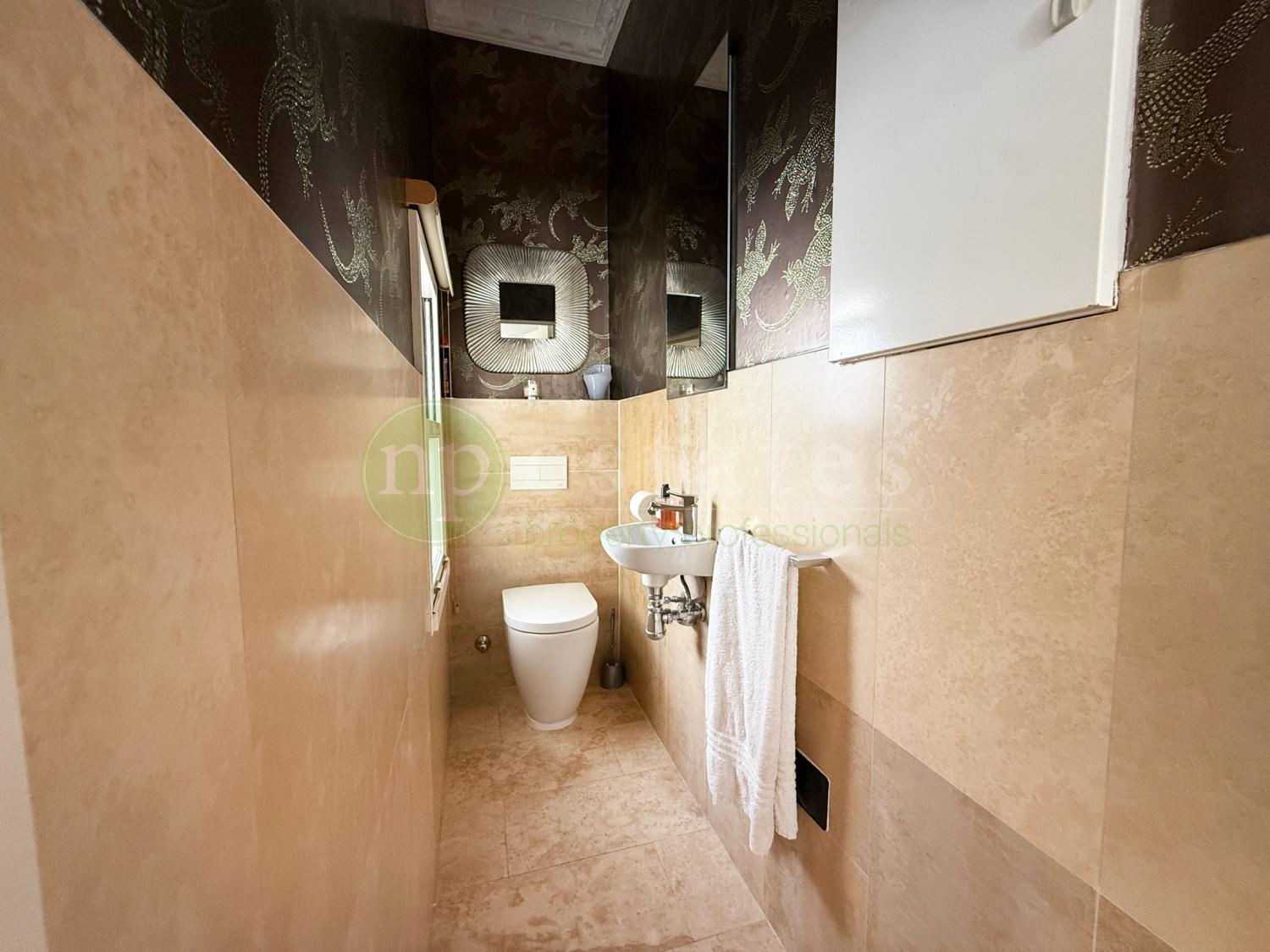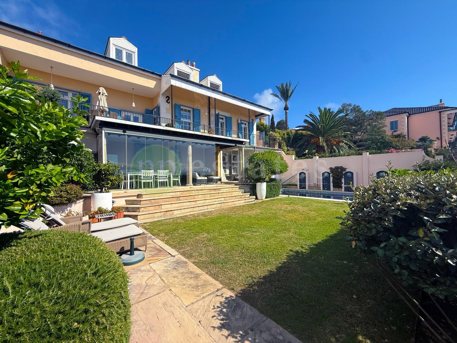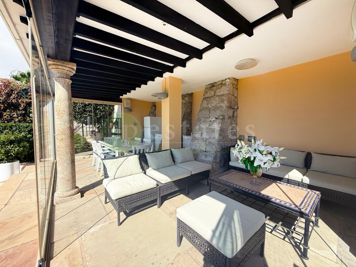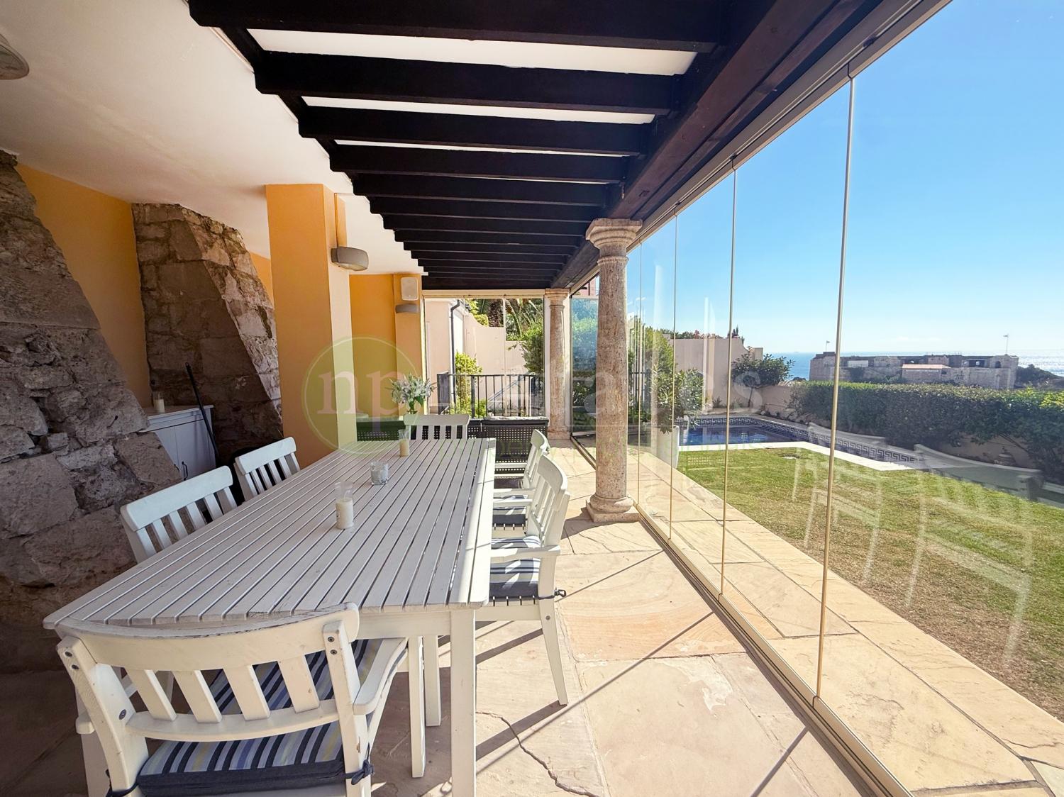 Set across three levels, the property offers generous living space with high ceilings on the main level, original fireplace, and traditional detailing throughout. The main level comprises a welcoming entrance hall with guest toilet, a large dining room, and an elegant living room that opens onto a west-facing terrace, enjoying sweeping views across the Bay and Strait of Gibraltar towards Africa. The fully fitted kitchen, equipped with high-quality appliances, also opens to the terrace, where an outdoor dining area makes the most of the spectacular outlook.
