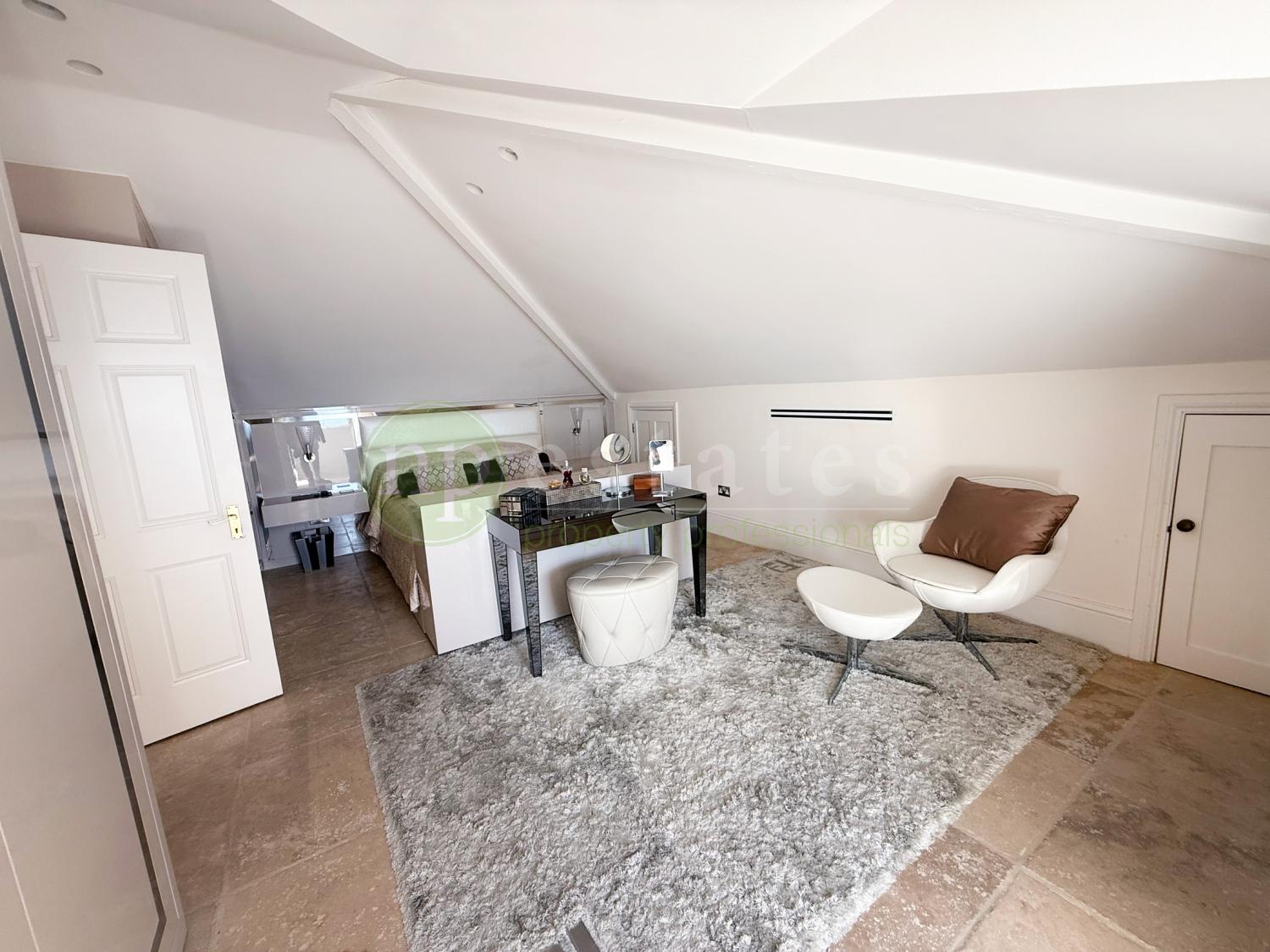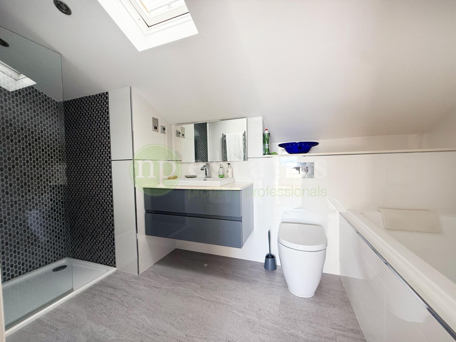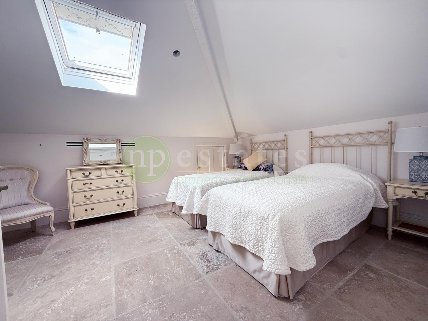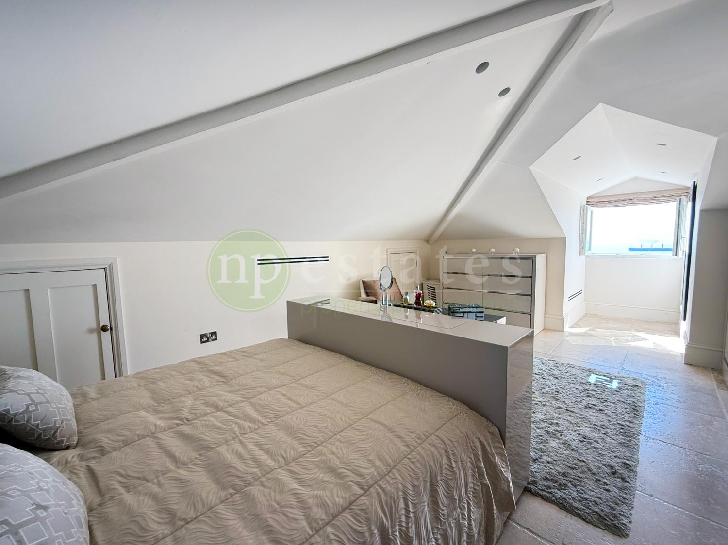 The principal bedroom is also located on this level, complete with dressing area, spacious en-suite bathroom with bath and shower, and direct access to the terrace. Upstairs, three further bedrooms are found, one of which is currently used as an office, all enjoying characterful sloped ceilings and ample storage.