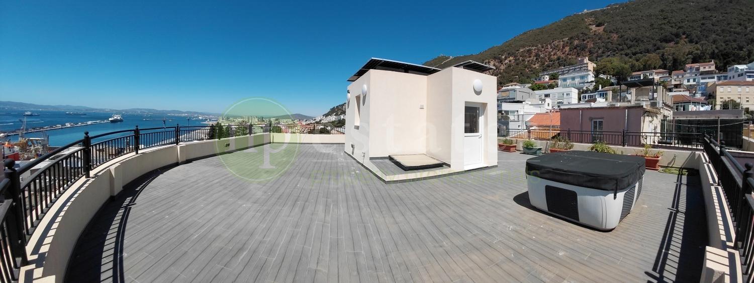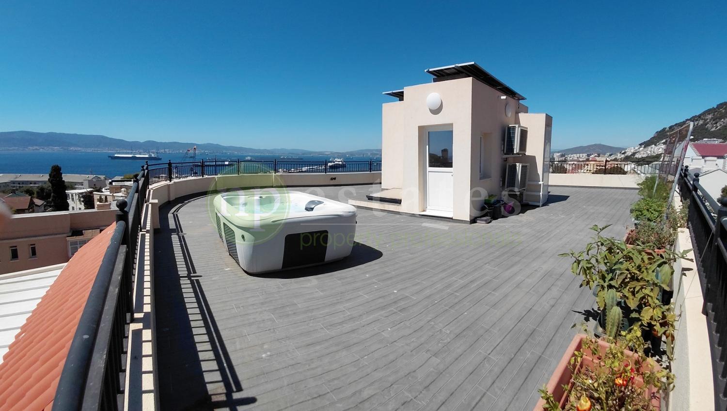 Outdoor space includes a wraparound balcony with views over the Bay, Rock, and Straits, and a private rooftop terrace with 360° outlooks and Jacuzzi. A solar panel system with battery backup improves energy efficiency.