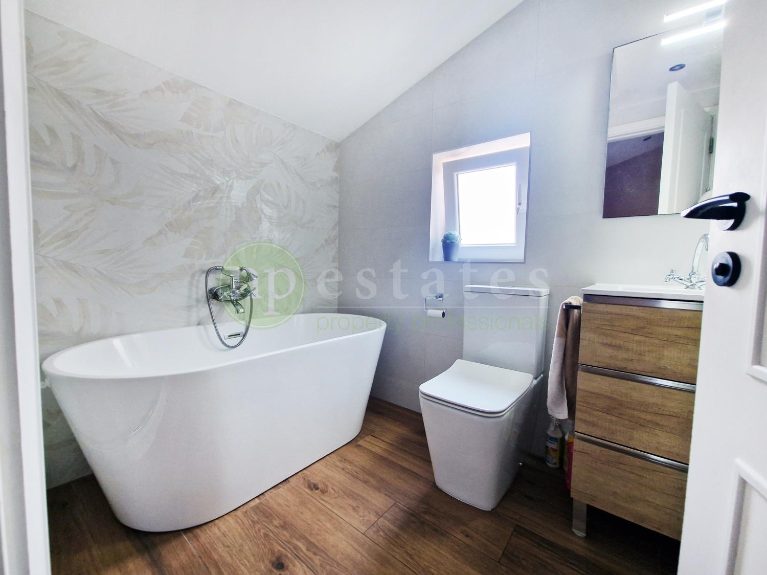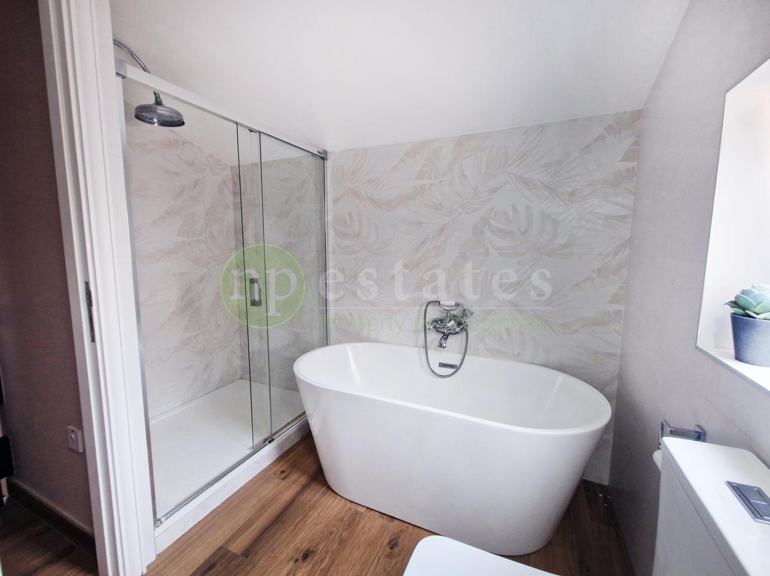 Upstairs, two double bedrooms are fitted with wardrobes, whilst the master bedroom offers a spacious walk in wardrobe and benefit from ample storage options. The family bathroom has been redesigned to incorporate both a walk-in shower and a freestanding bathtub, stylish & functional. A large attic above the bedrooms offers valuable storage space for seasonal items and larger belongings.