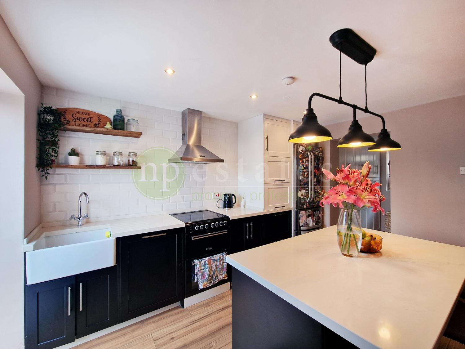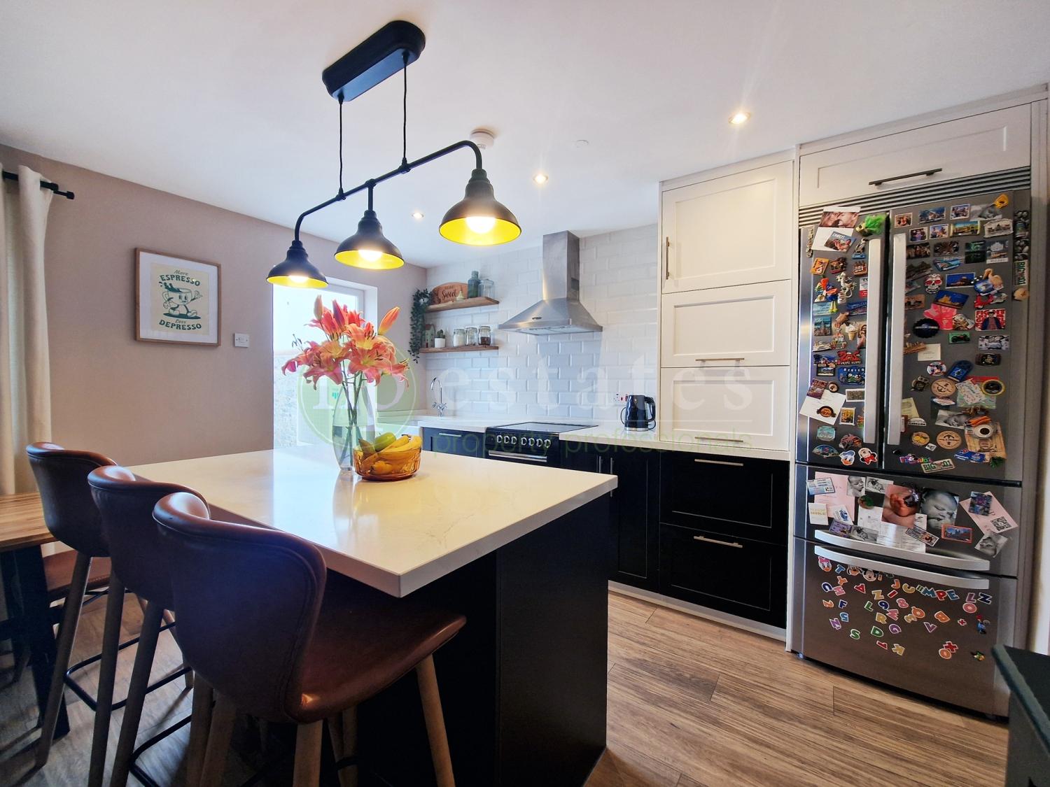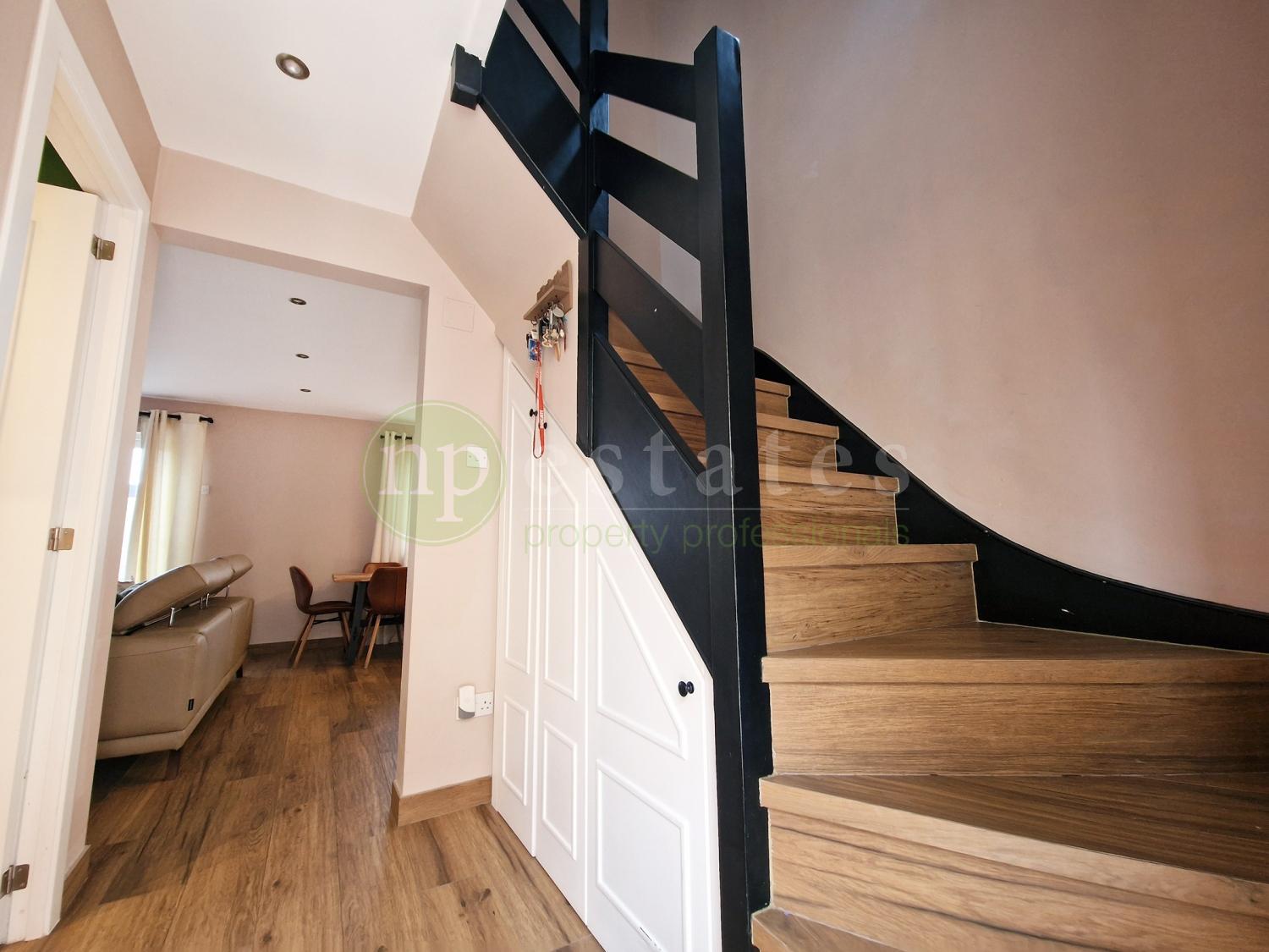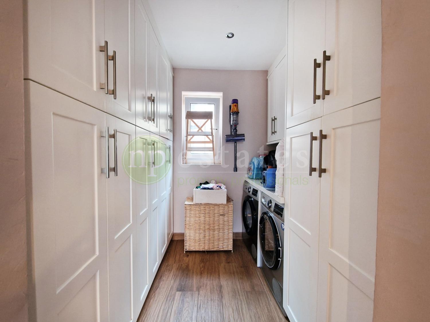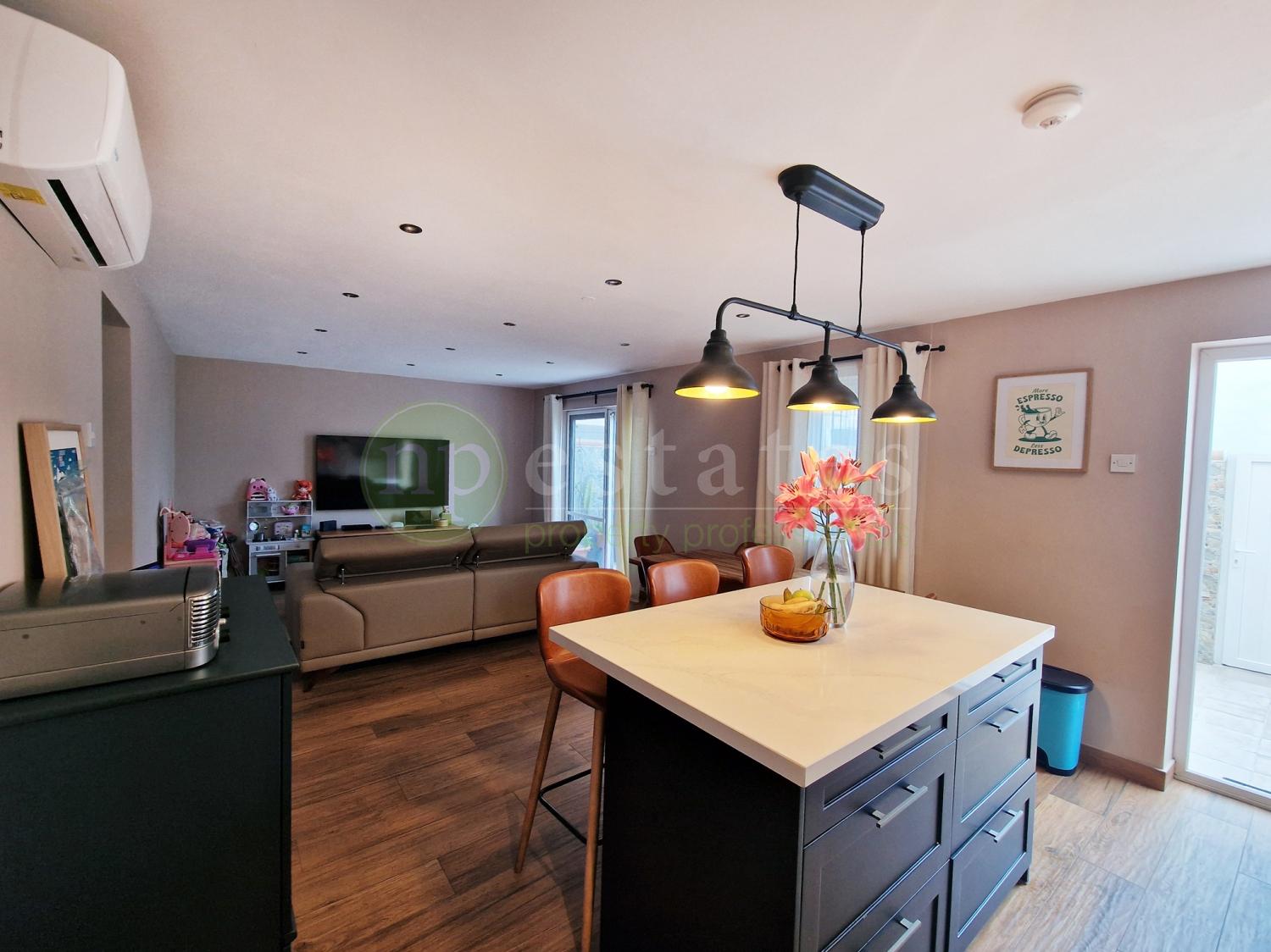 Arranged over two levels, the property offers a practical and well-designed layout. The ground floor features a spacious open-plan kitchen with central island, flowing into a comfortable living area. From here, access leads to a dedicated utility and pantry space, along with a guest toilet thoughtfully positioned to separate the living areas from the sleeping quarters upstairs. Additional under-stairs storage adds further convenience.