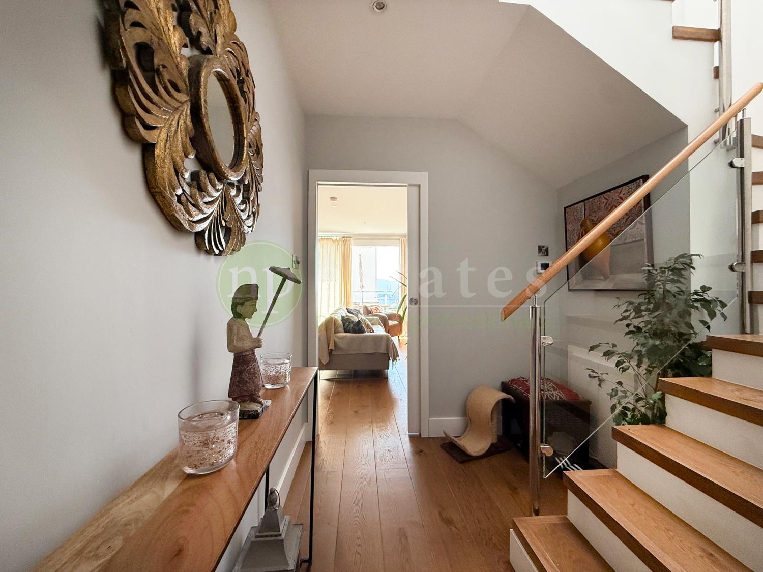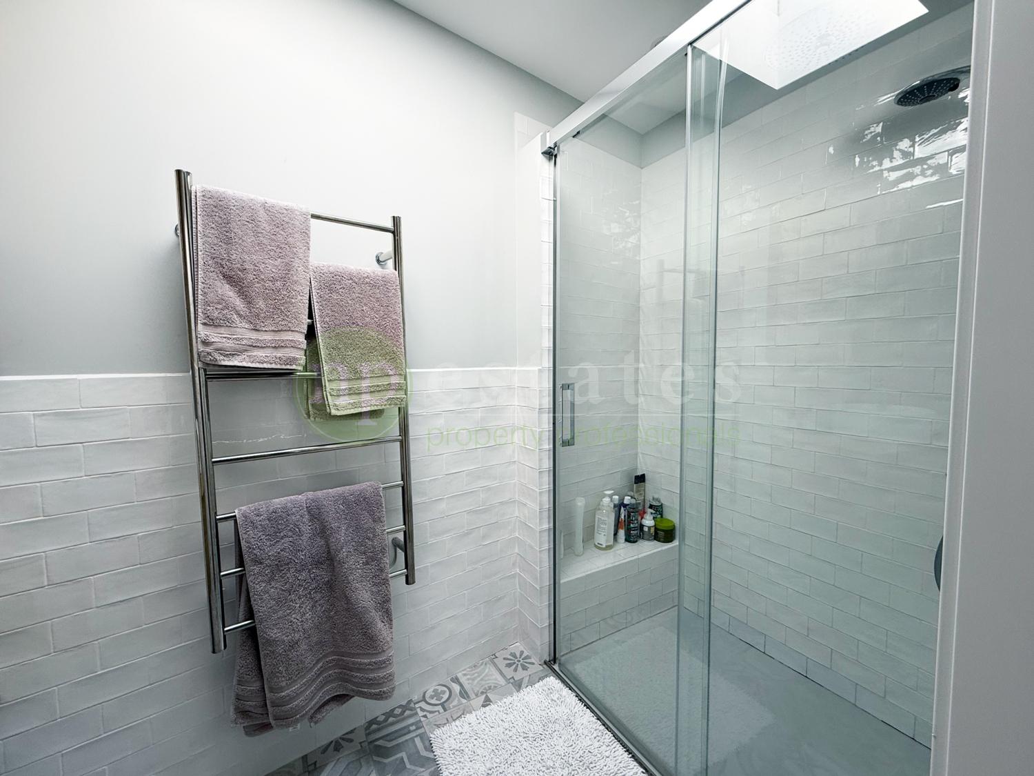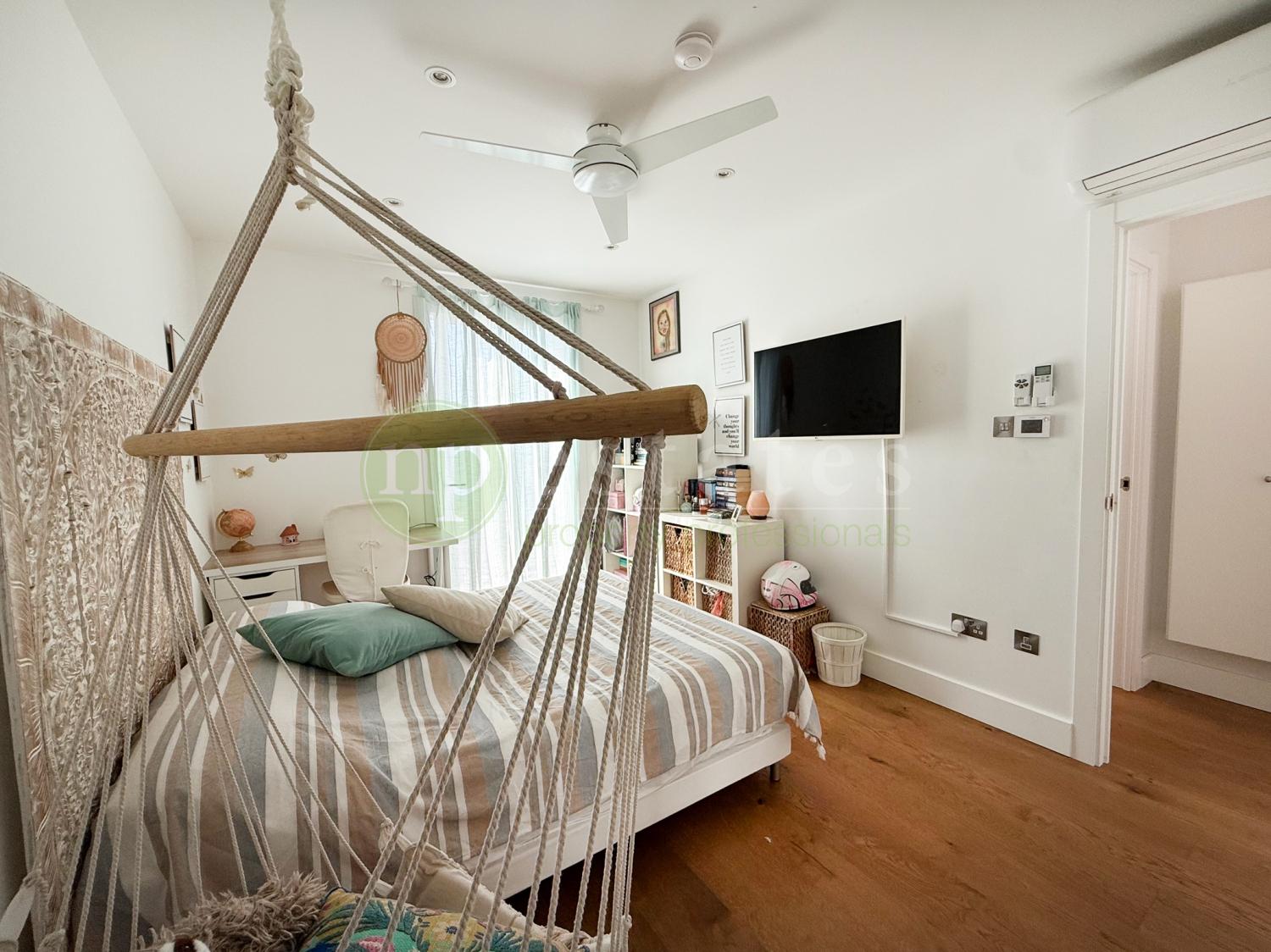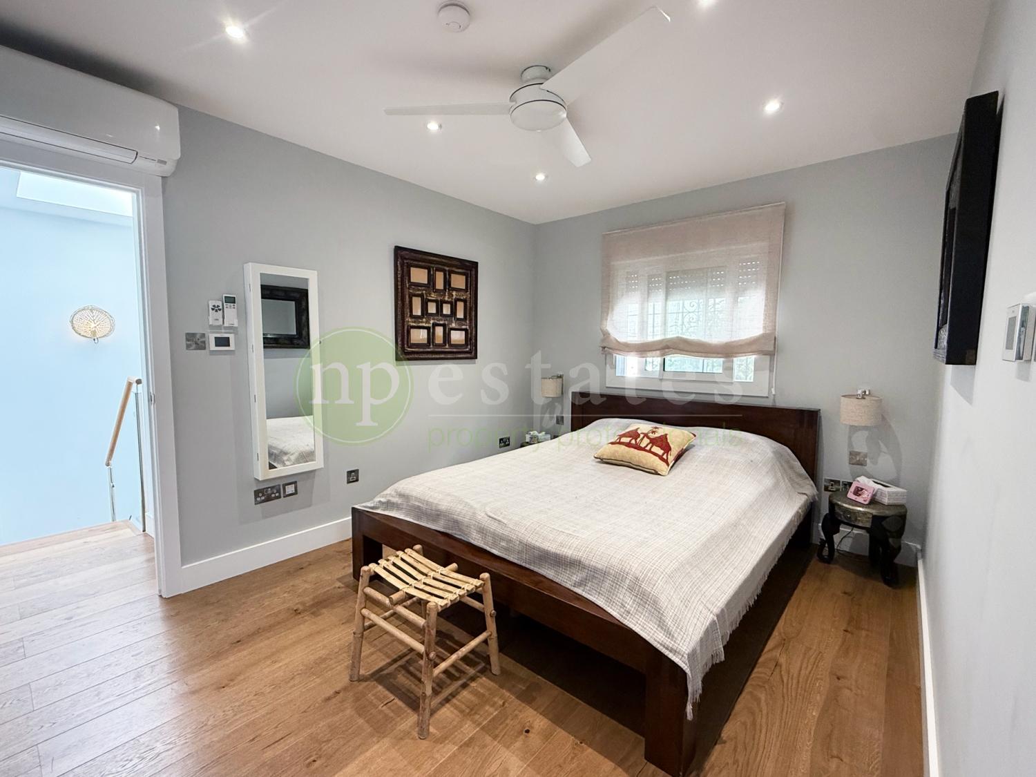 A striking stairwell fitted with a large skylight fills the home with natural light, leading to the upper level where four spacious bedrooms are located. The master suite includes a private en-suite bathroom, while two additional bedrooms enjoy access to a shared terrace. The family bathroom features its own skylight, enhancing the sense of light and space.