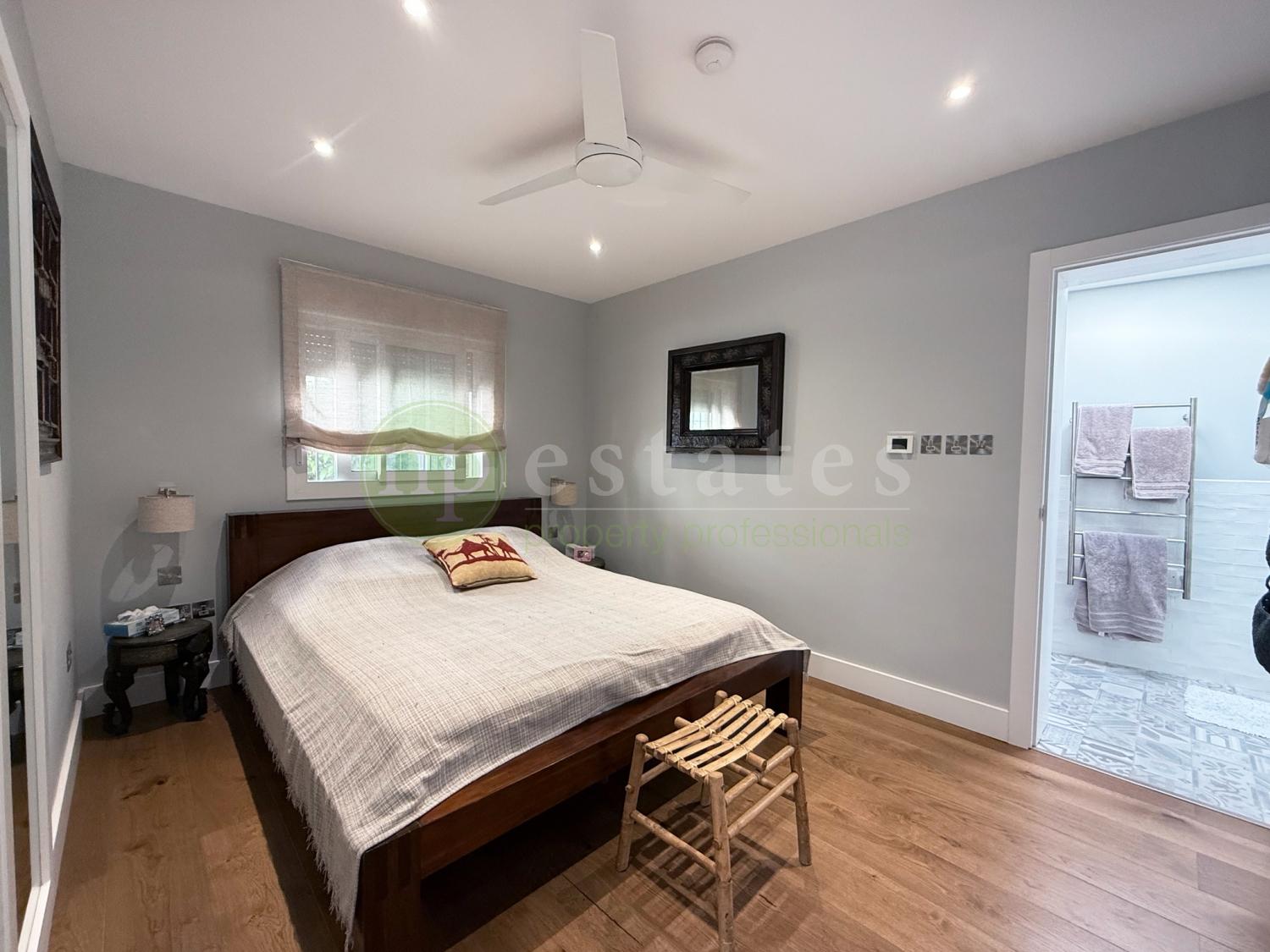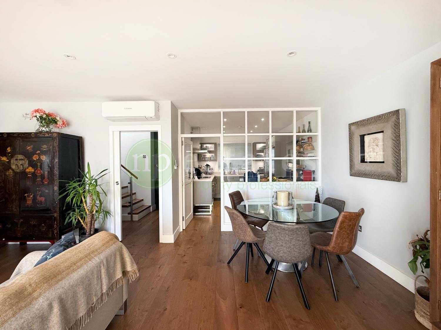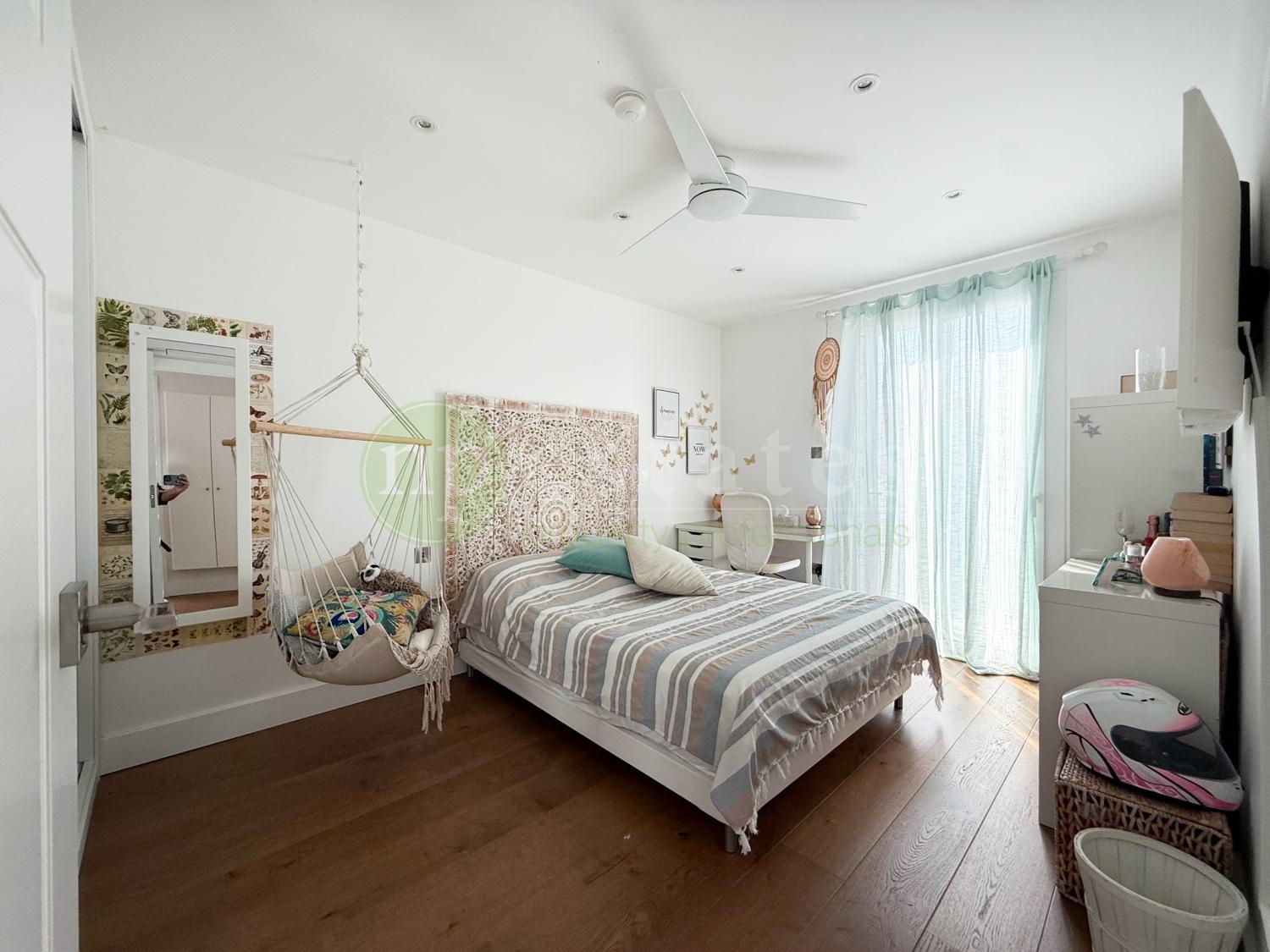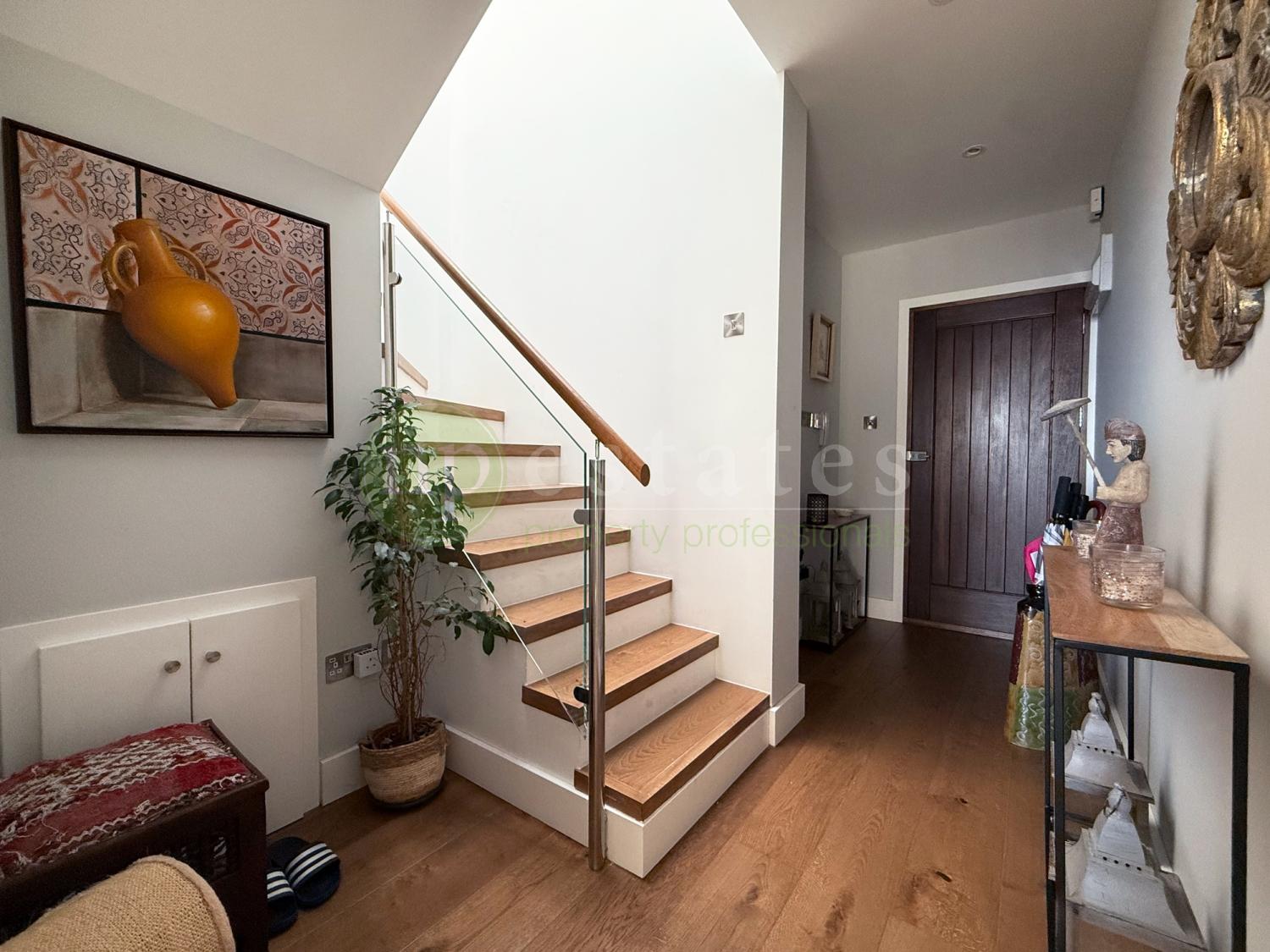 A striking stairwell fitted with a large skylight fills the home with natural light, leading to the upper level where four spacious bedrooms are located. The master suite includes a private en-suite bathroom, while two additional bedrooms enjoy access to a shared terrace. The family bathroom features its own skylight, enhancing the sense of light and space.