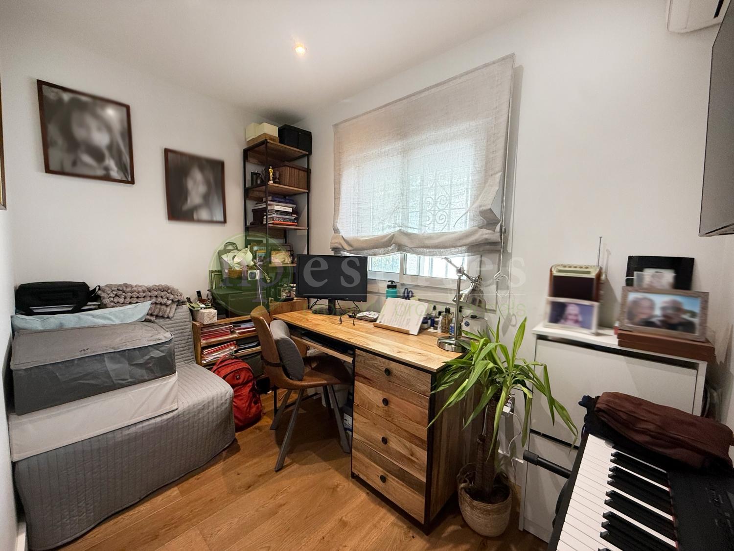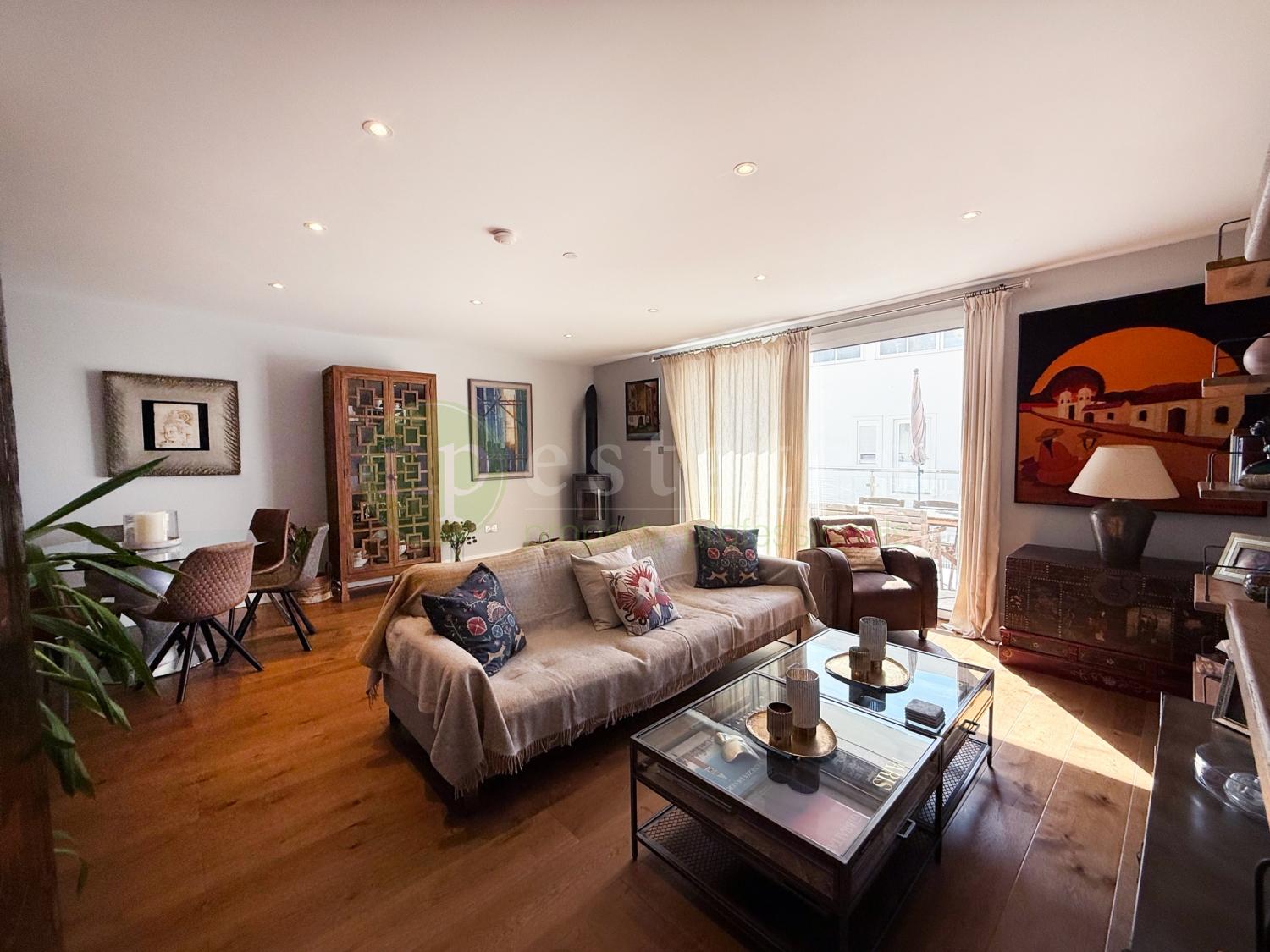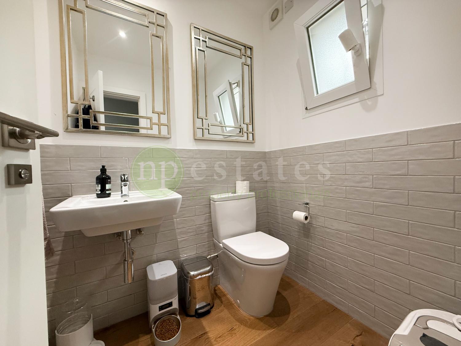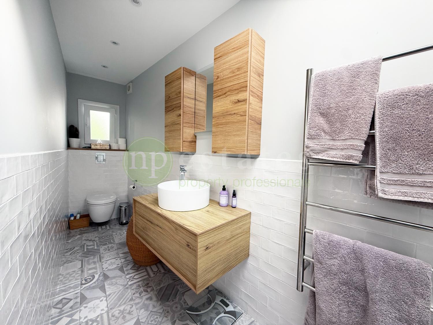 A striking stairwell fitted with a large skylight fills the home with natural light, leading to the upper level where four spacious bedrooms are located. The master suite includes a private en-suite bathroom, while two additional bedrooms enjoy access to a shared terrace. The family bathroom features its own skylight, enhancing the sense of light and space.