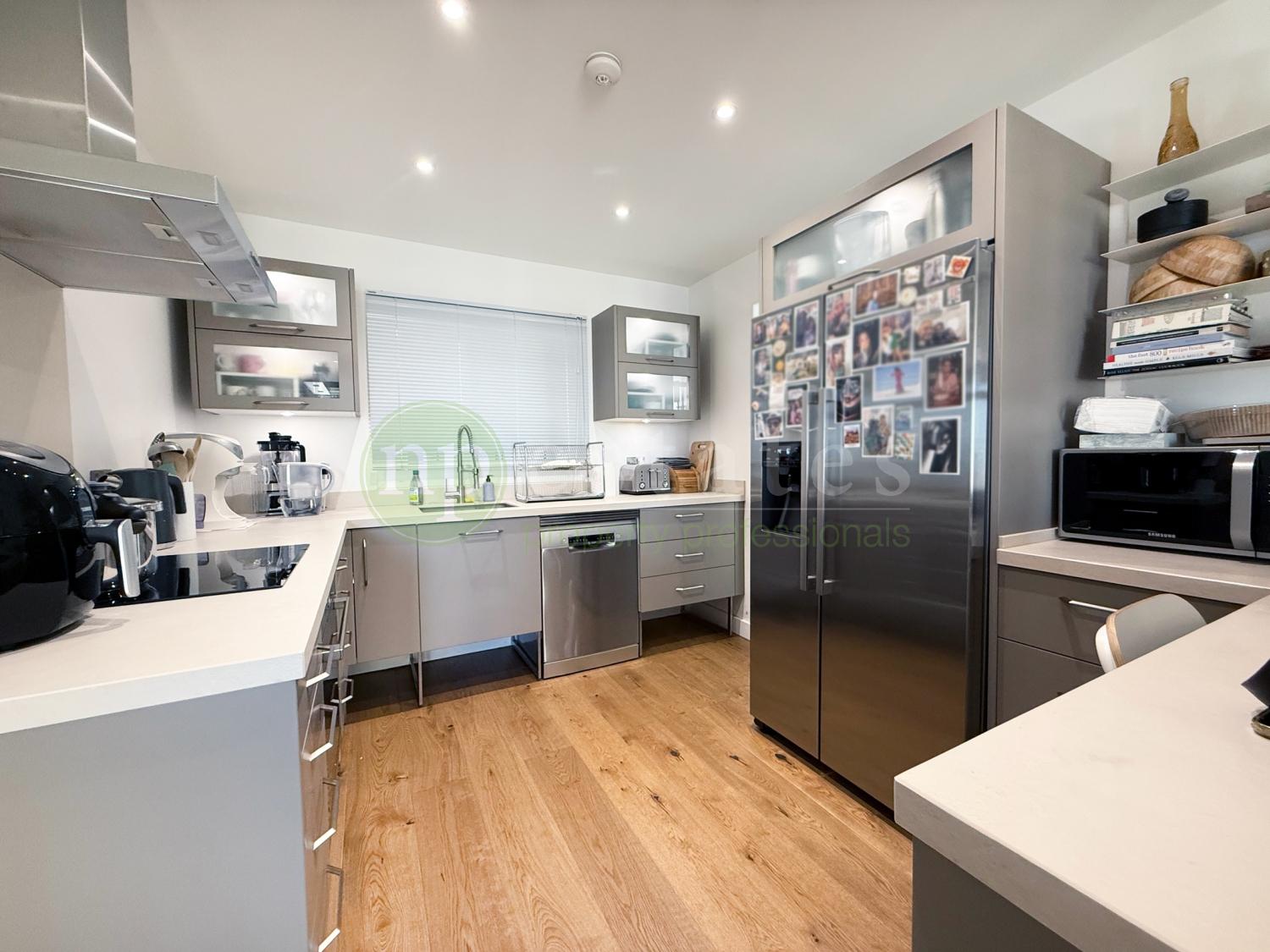 The main floor features a bright and inviting lounge with direct access to a west-facing terrace. A contemporary open-plan kitchen, complete with breakfast bar and adjoining utility room, while a guest cloakroom adds convenience.