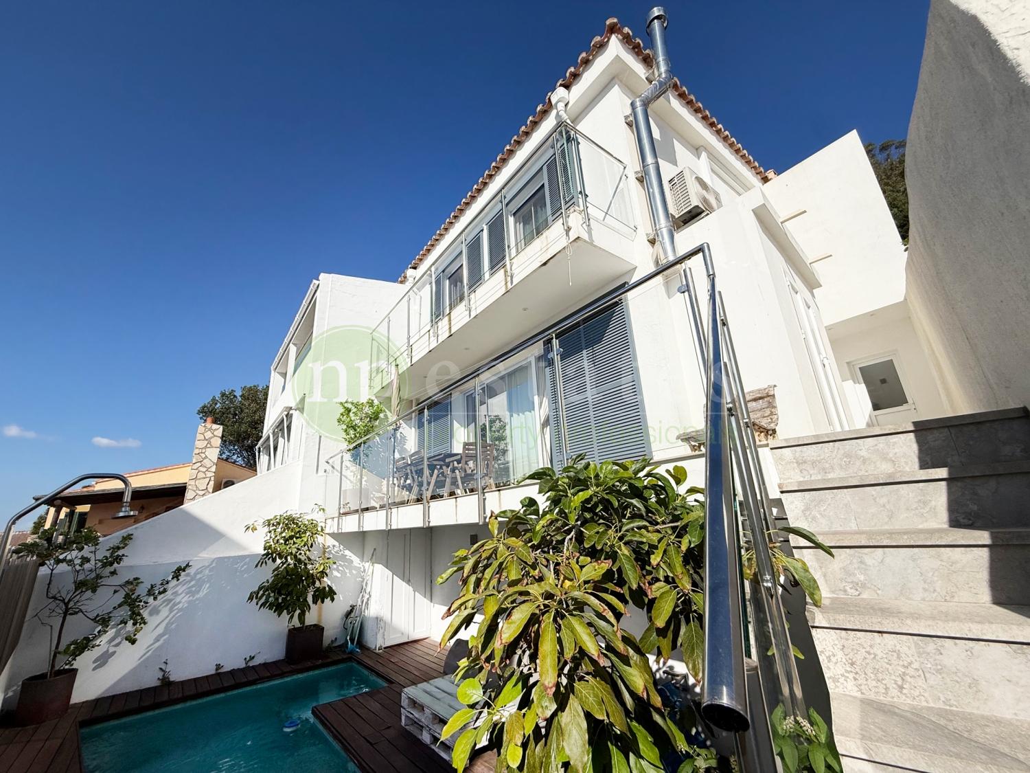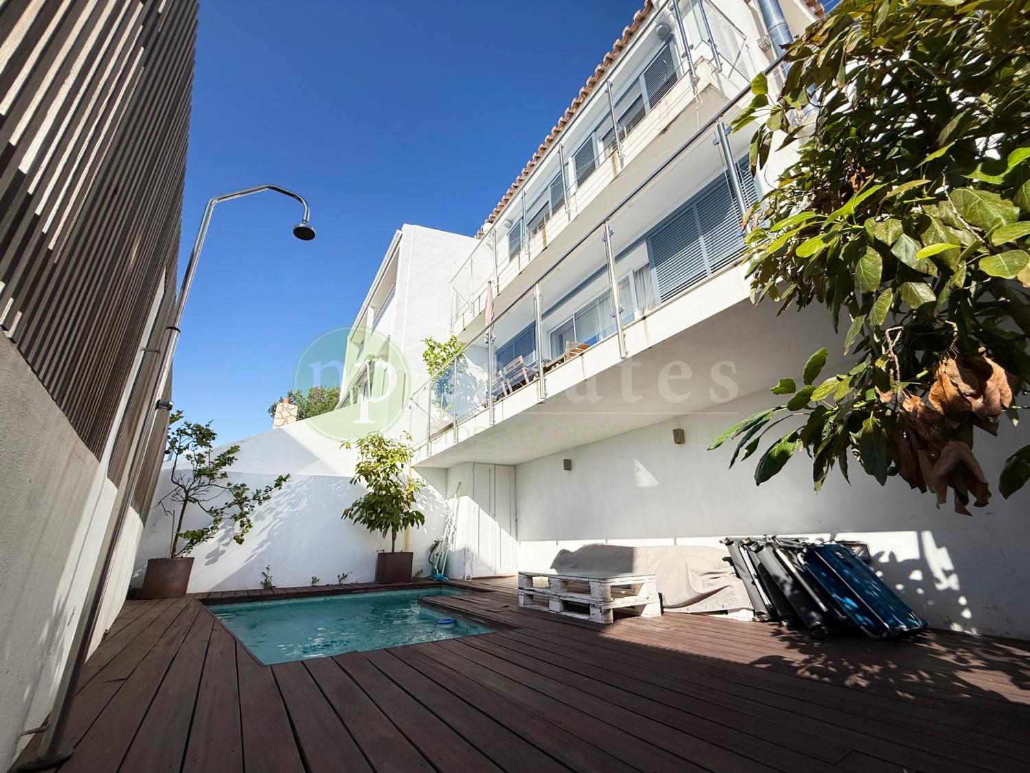 The outdoor spaces have been designed for relaxation and entertaining, including a large ground-floor patio with a private swimming pool, a front storage shed housing the boiler, and a rear patio with an additional storage room. The living room terrace also connects directly to the lower patio and pool area, creating a seamless flow between indoor and outdoor living.